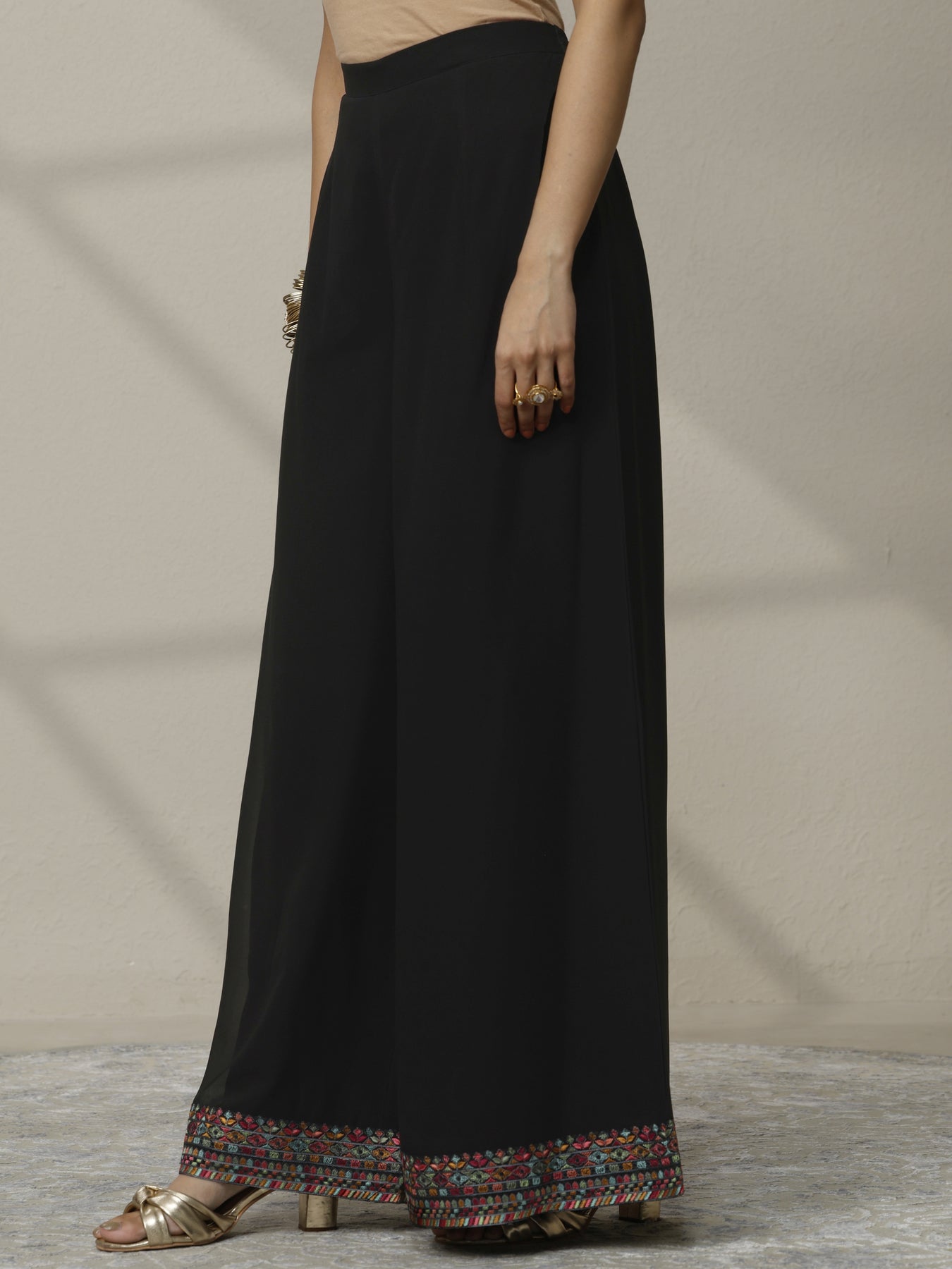 Our 3-piece black georgette straight-fit kurta set features a V-neckline, regular sleeves, and statement yoke. Complemented with lining and palazzo pants with a partially elasticated waistband, and an embroidered dupatta. Adorned with floral embroidered, this style is perfect for dark festive occasions.