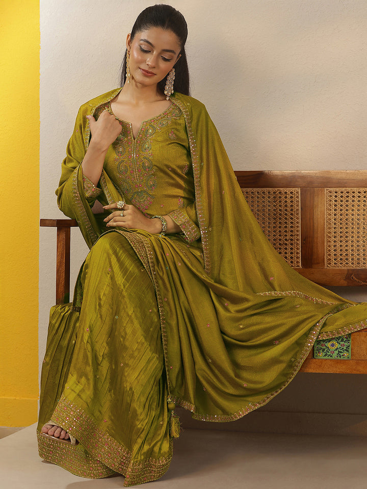 Libas Art Green Embroidered Silk Blend Straight Suit Set With Dupatta