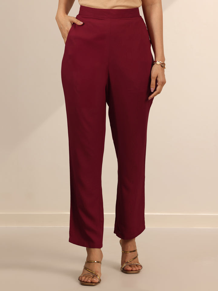 Our 1-piece maroon viscose A-line features a V-neckline, regular sleeves, and statement yoke. Adorned with solid embroidery, this style is perfect for semi-festive occasions.