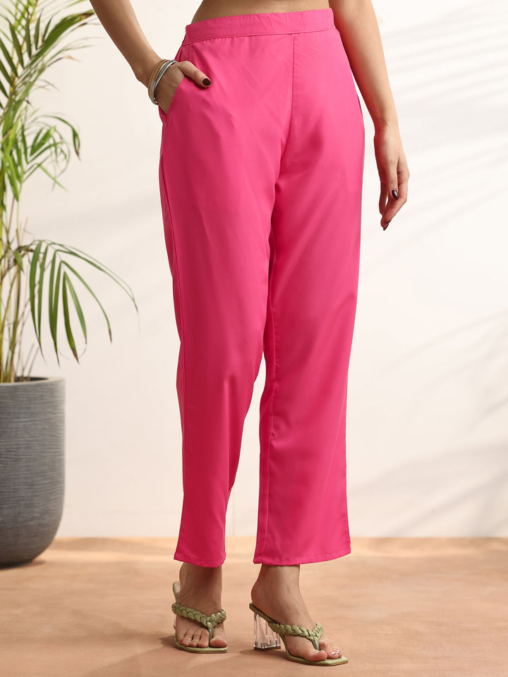 Our 3-piece pink and green silk blend straight-fit kurta set features a round neckline, regular sleeves, and a statement yoke. Complemented with straight pants with a partially elasticated waistband and a printed dupatta. Adorned with ethnic motif, this style is perfect for festive occasions.