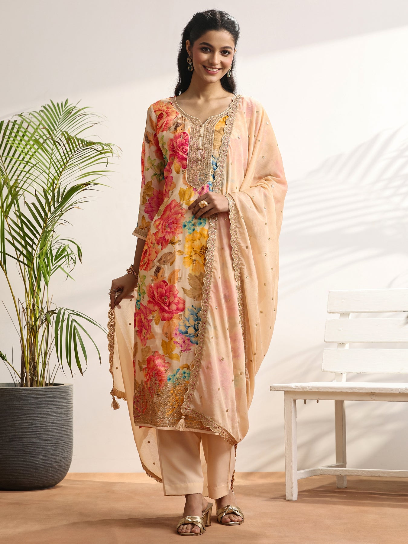 Our 3-piece Peach, Multi Silk blend Straight-fit Kurta Set features a Round Neckline, Regular Sleeves, and statement Yoke. Complemented with Straight Pants with a Partially Elasticated waistband and 2 pockets, and an Embroidered dupatta. Adorned with floral printed and embroidered, this style is perfect for Festive occasions.