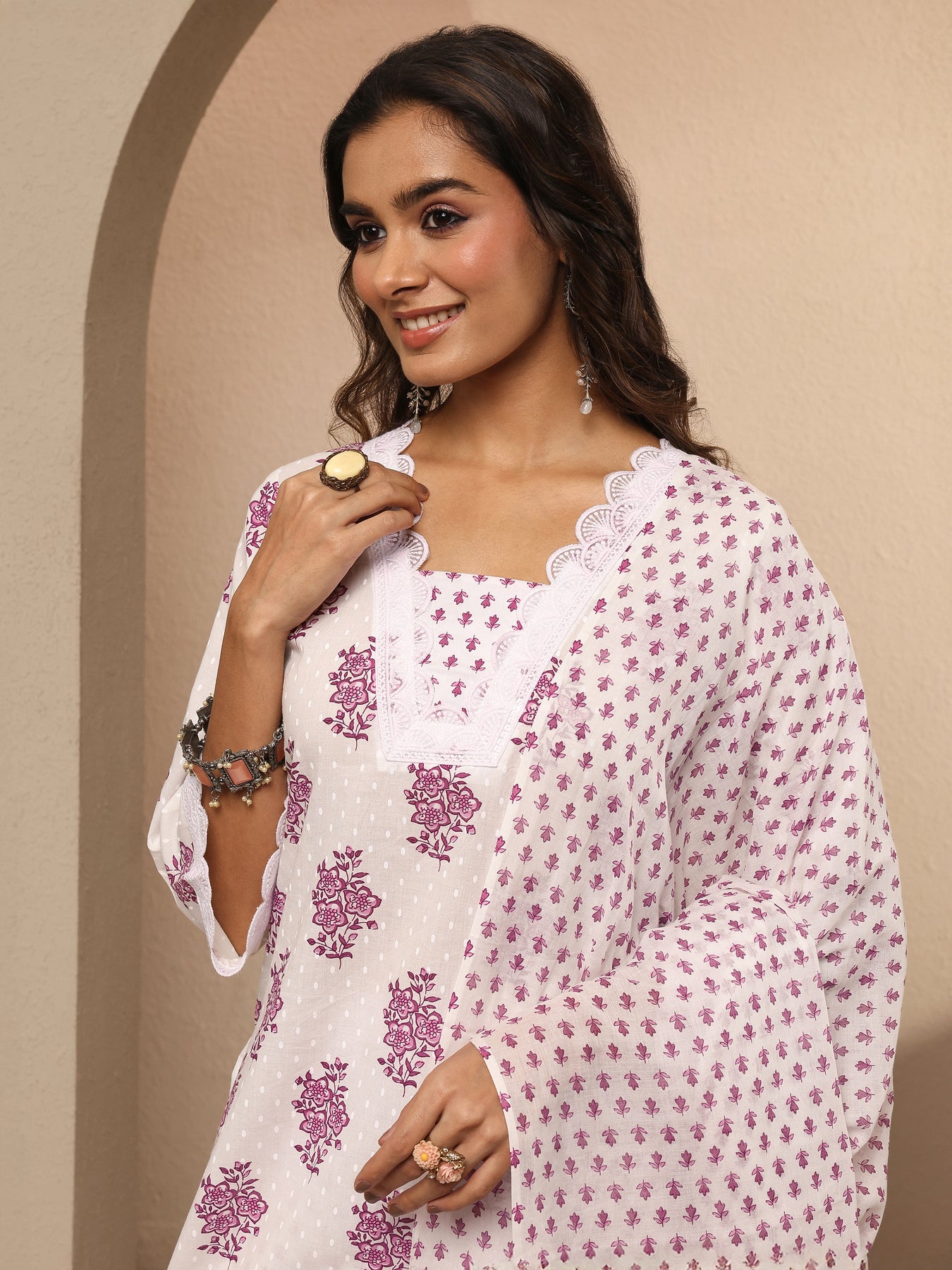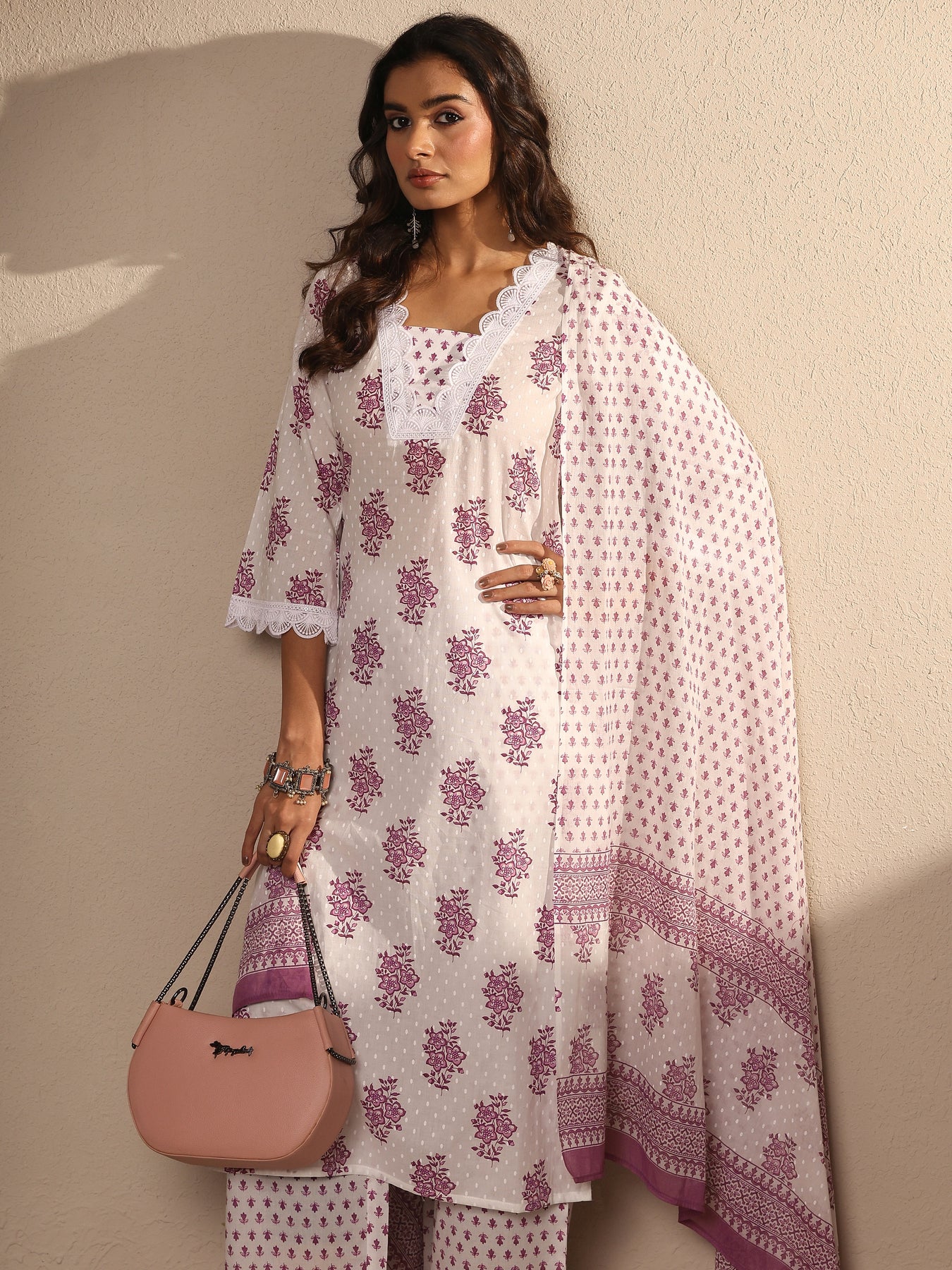 Off White Printed Cotton Straight Suit Set With Dupatta