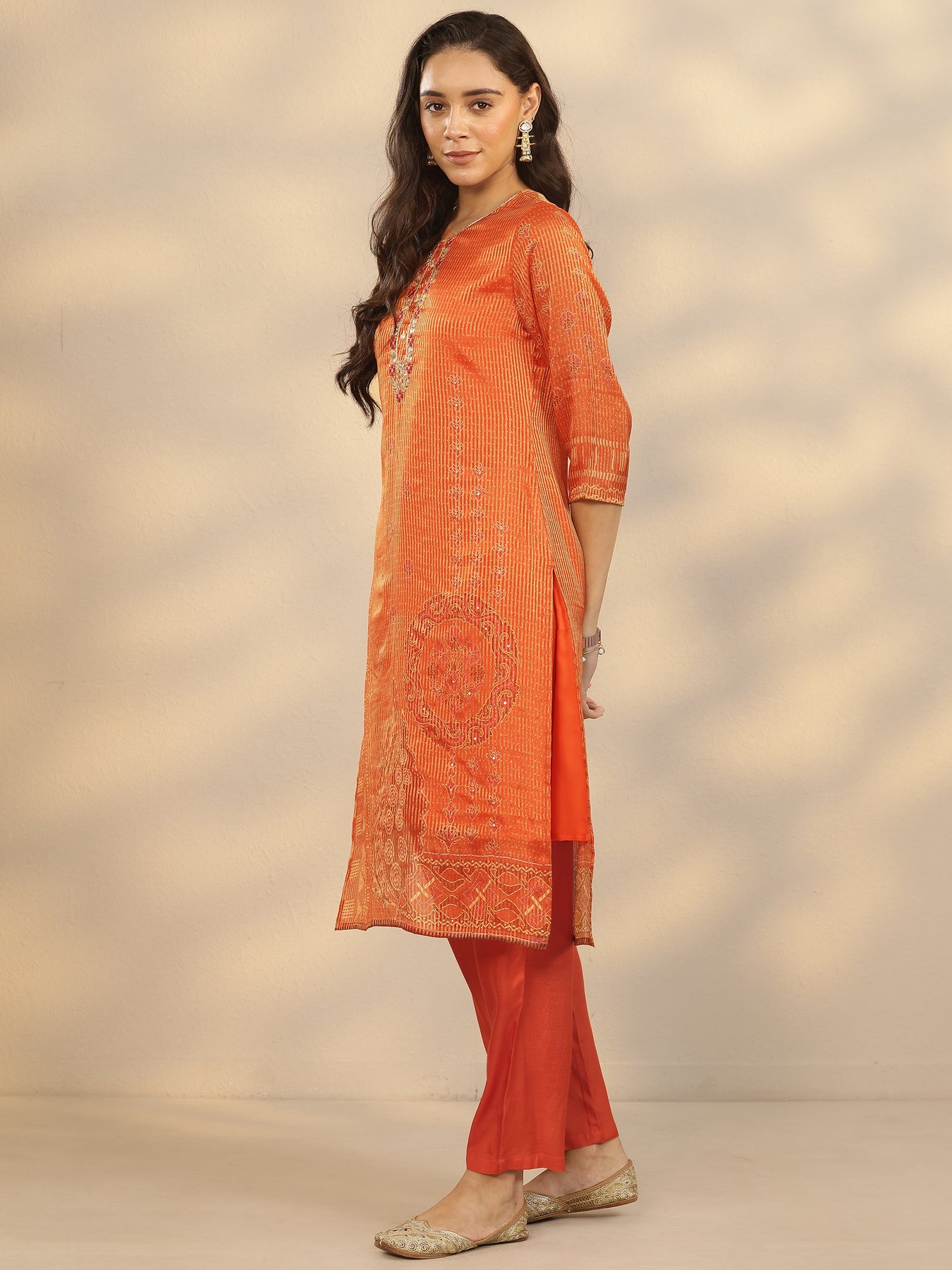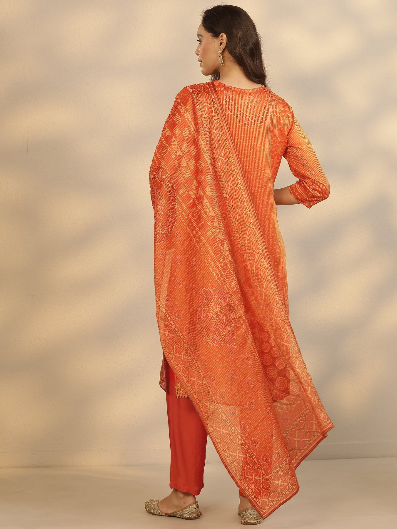 Orange Printed Silk Blend Straight Suit Set With Dupatta