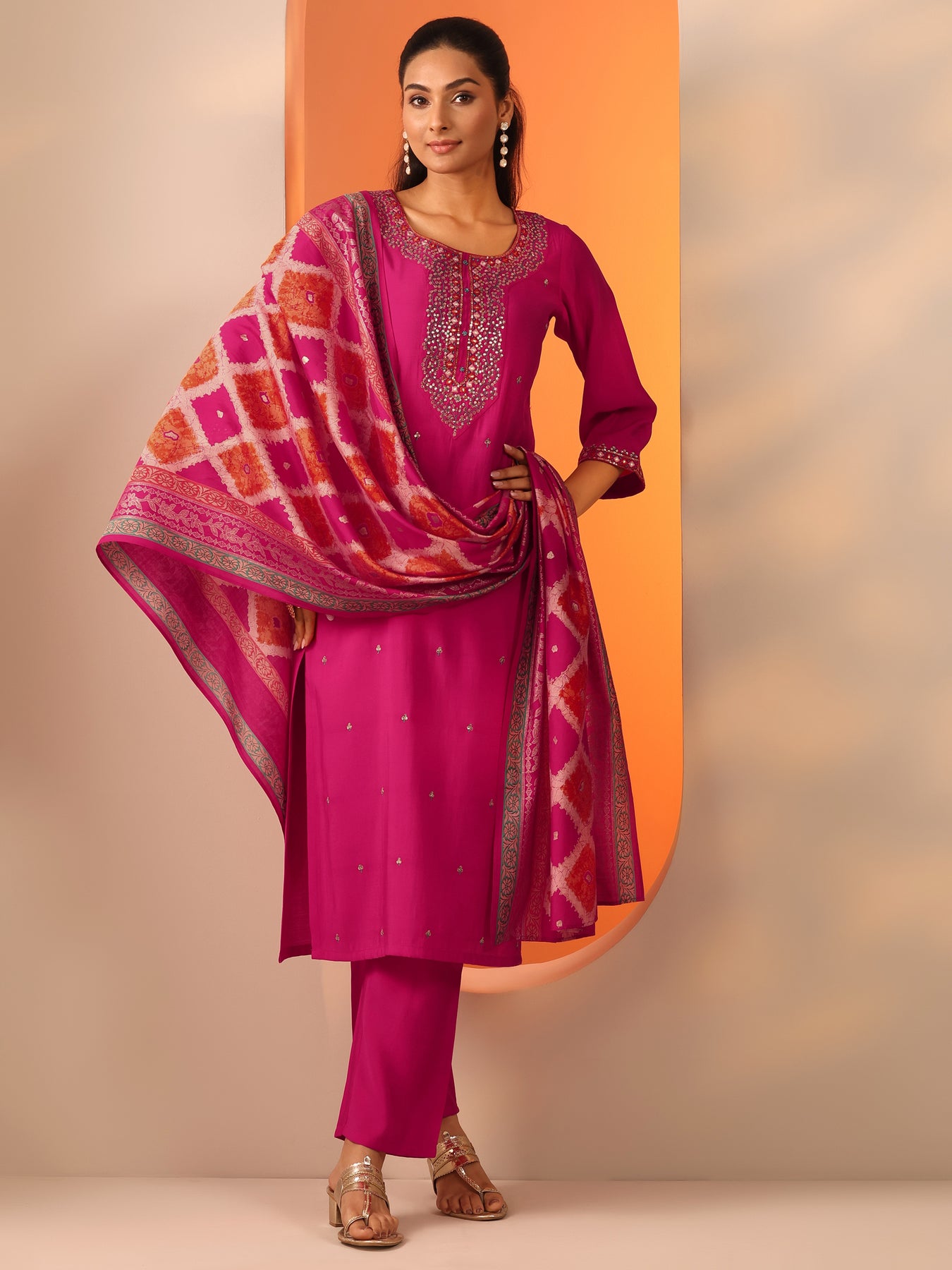 Pink Embellished Rayon Straight Suit Set With Dupatta