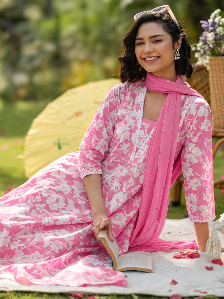 Pink Printed Cotton Anarkali Suit Set With Dupatta