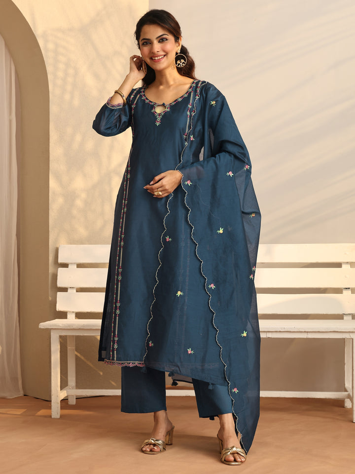 Teal Embroidered Silk Blend Straight Suit Set With Dupatta