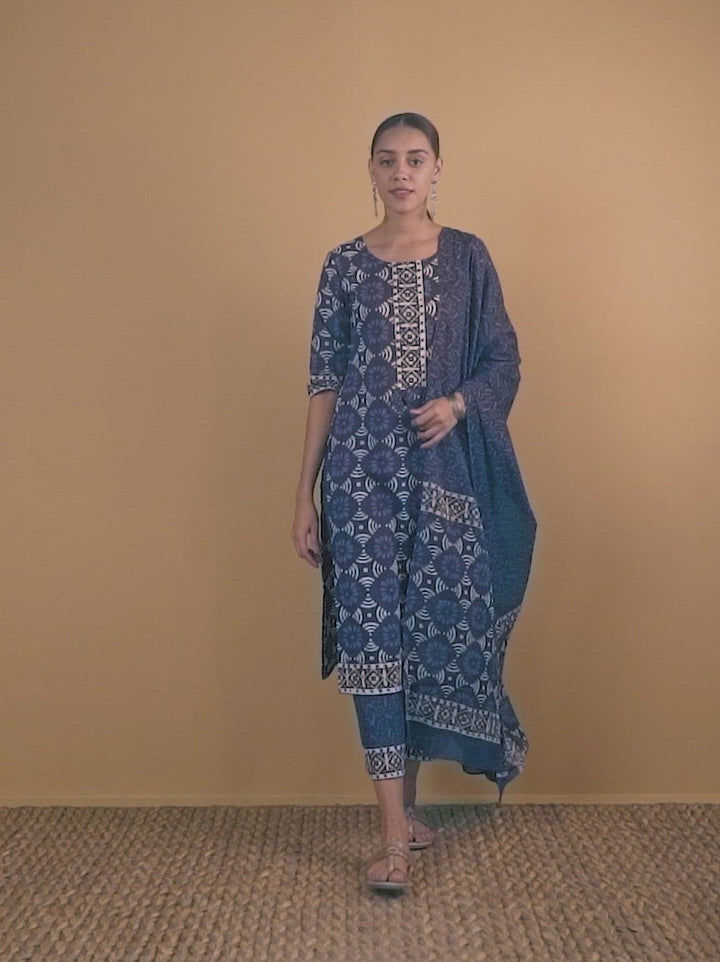 Blue Printed Cotton Straight Kurta With Palazzos & Dupatta