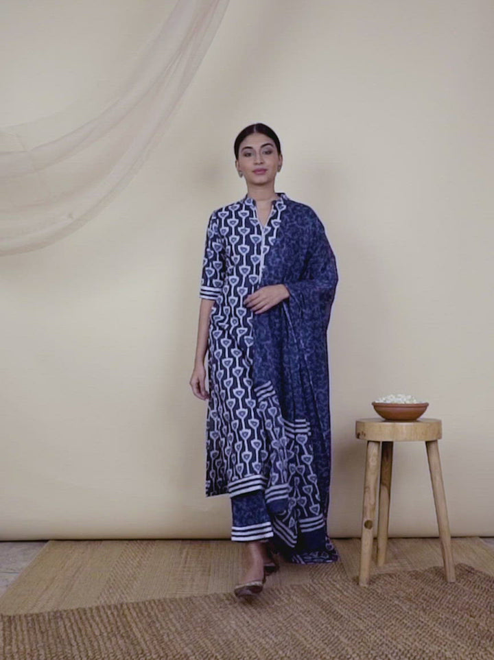 Blue Printed Cotton Straight Kurta With Palazzos & Dupatta