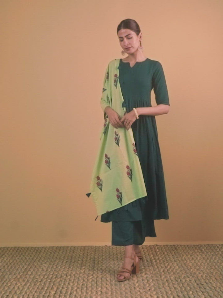 Green Flared Kurta with Palazzos & Tassel Detail Stole