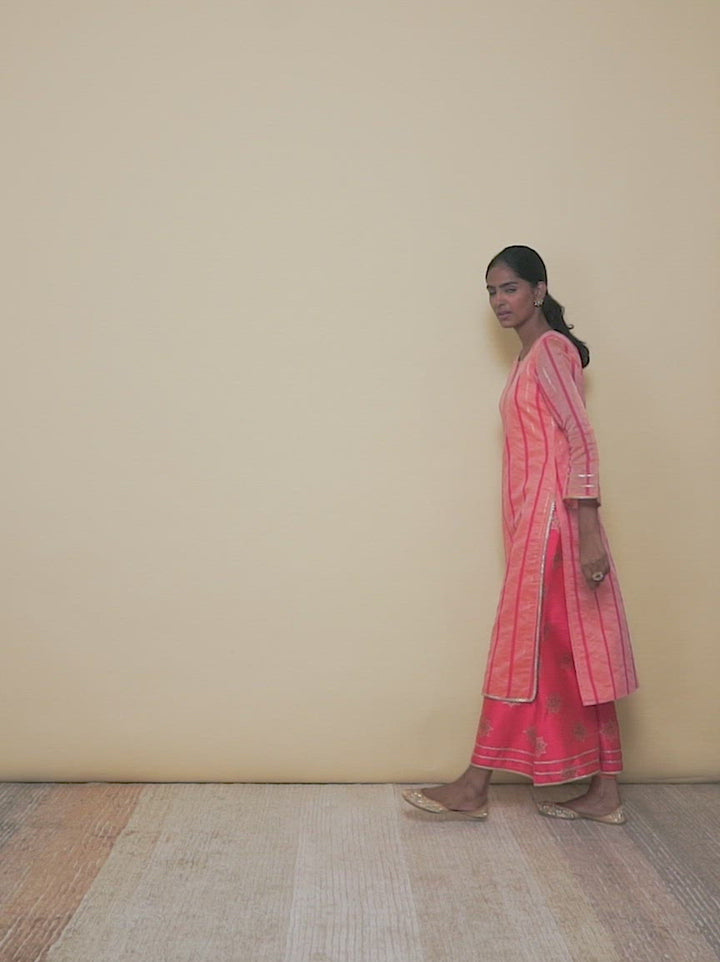 This 2-piece suit set includes our orange round neck straight kurta,and flared palazzo pants. Featuring tonal stripes and tinted motifs detailed with Gota Patti work. A great choice for close family gatherings.