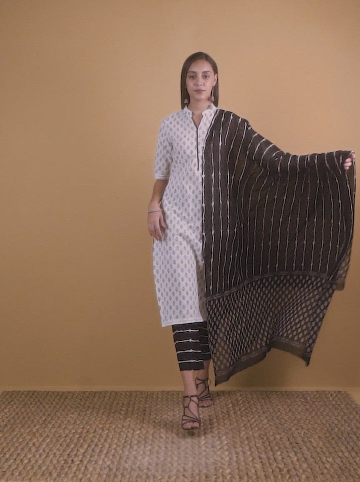This 3-piece suit set includes our white v-neck mandarin collar kurta, straight palazzo pants and dupatta in contrasting prints. Featuring black-hued motifs and piping trim details. Perfect for a busy day at work.
