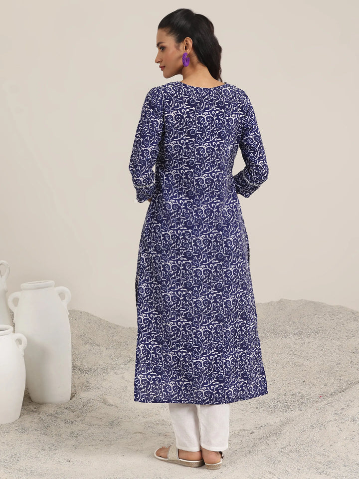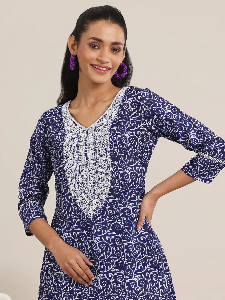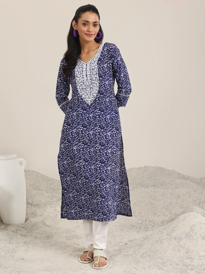 Our Indigo printed silk blend straight kurta features a V-neckline, three-quarter sleeves, and a statement yoke. Highlighted with intricate thread work and sequins, this style is perfect for work and beyond.,