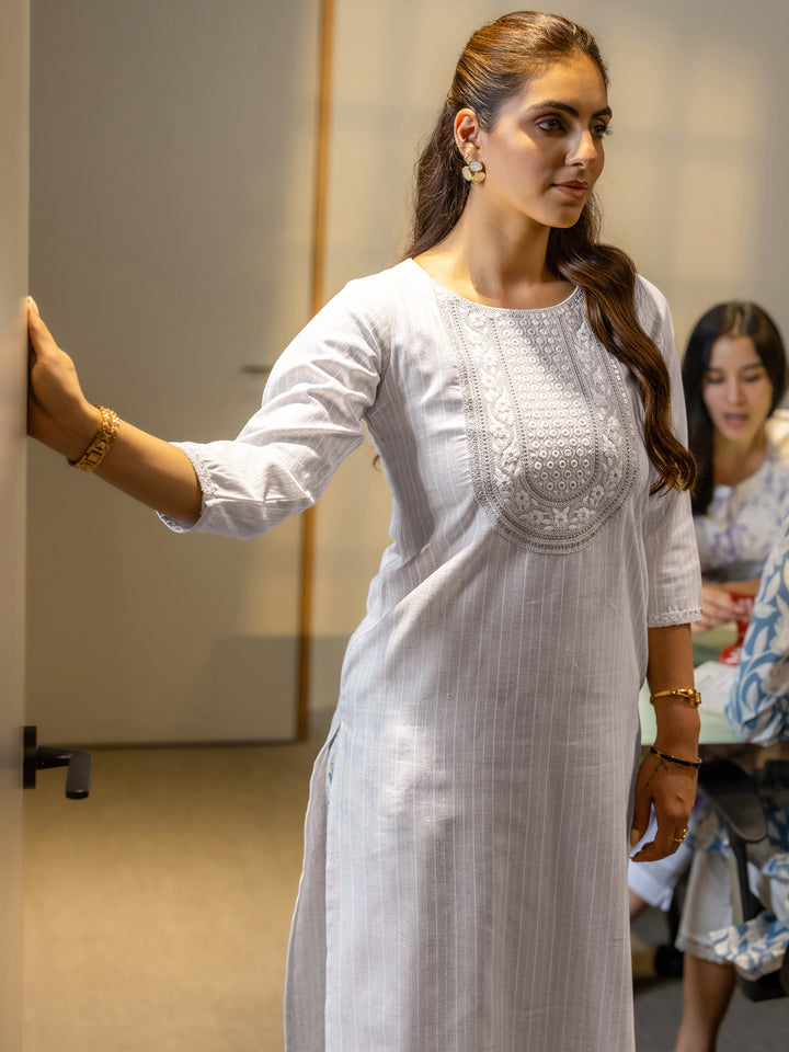 Our Off White Cotton Blend features a Straight-fit Kurta with a Round Neckline, Regular Sleeves. Adorned with Striped prints and Embroidered accents, this style is perfect for Casual occasions.