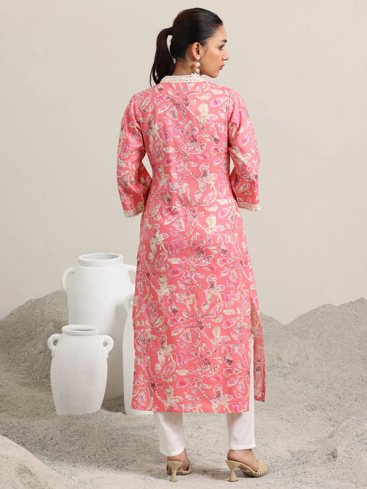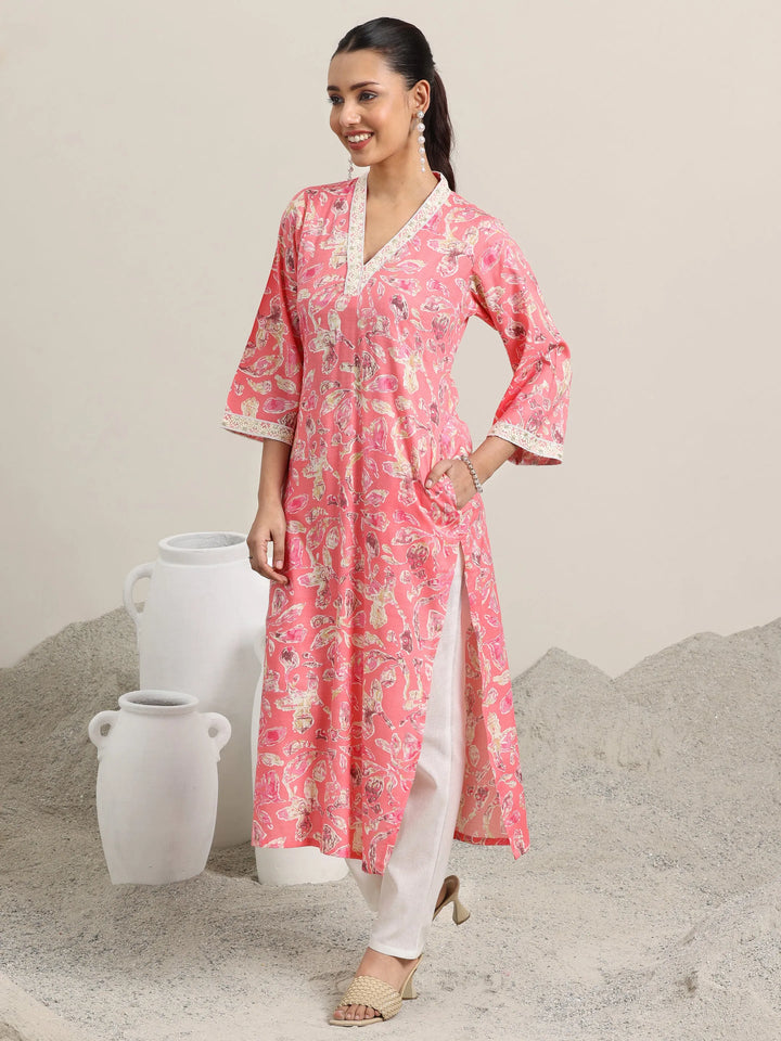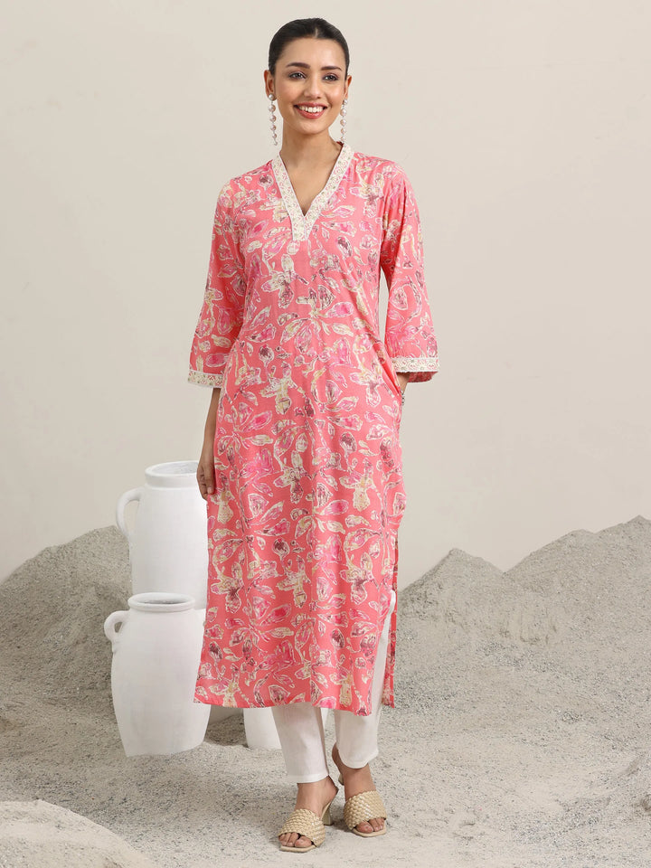 Our pink printed cotton blend straight kurta features a V-neckline and three-quarter flared sleeves. Highlighted with lace detailing and floral prints, this style is perfect for work and beyond.