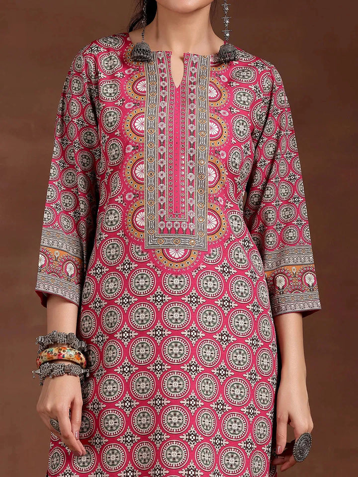 Our pink printed straight-fit kurta, crafted in crepe fabric, features a keyhole neckline and three-quarter sleeves. Elevated with geometric and ethnic motifs prints, this style is perfect for casual outings.