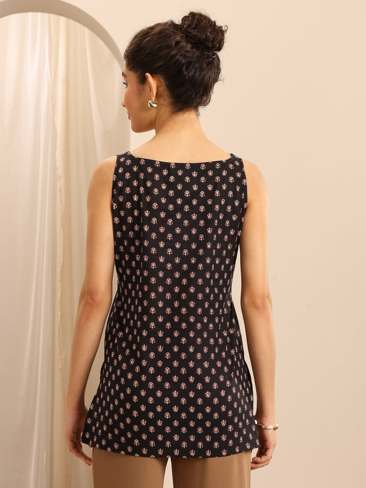 Our 1-piece black cotton straight-fit kurta features a square neckline and statement Yoke. Adorned with floral printed embellishments, this style is perfect for casual wear.