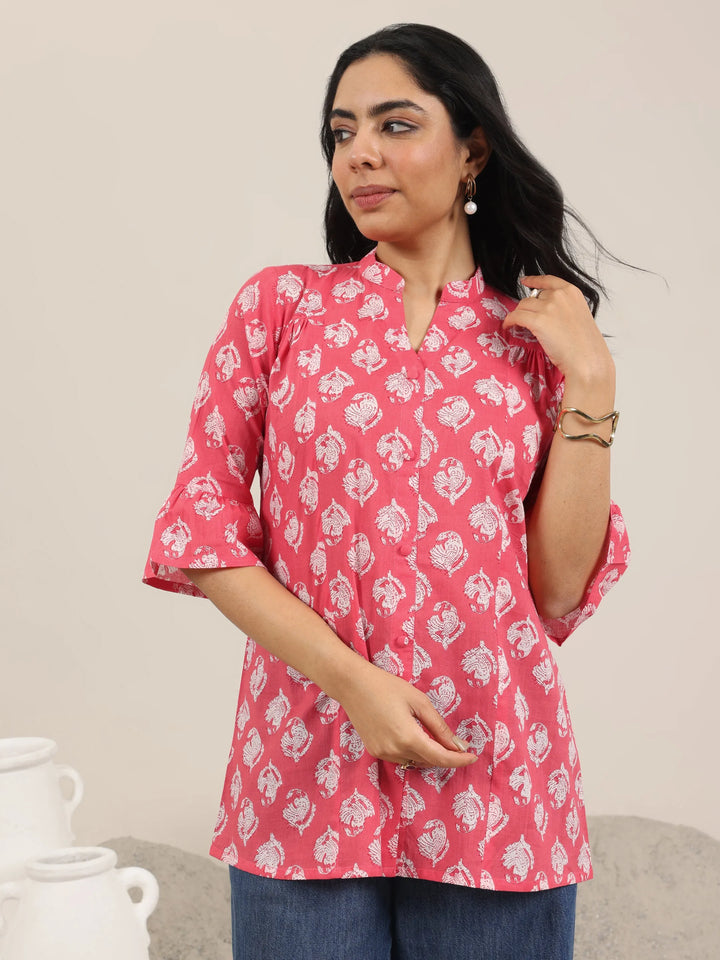 Our 1-piece pink cotton straight-fit kurta features a mandarin collar neckline, flared sleeves, and statement Yoke. Adorned with ethnic motifs prints, this style is perfect for casual wear.