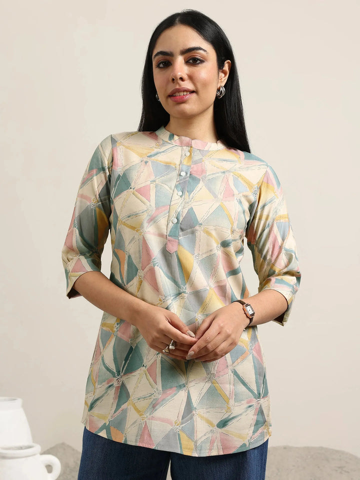 Our multi printed silk blend straight kurti features a mandarin collar and three-quarter sleeves. Highlighted with geometric prints and stylish buttons, this style is perfect for casual outings.