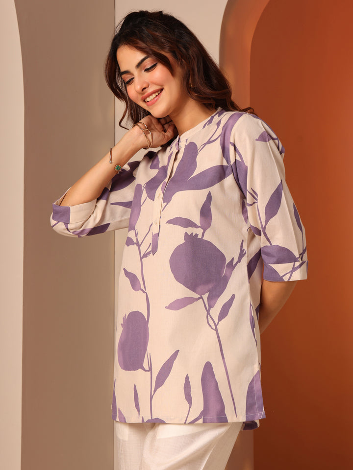 Off White Printed Cotton Straight Short Kurti