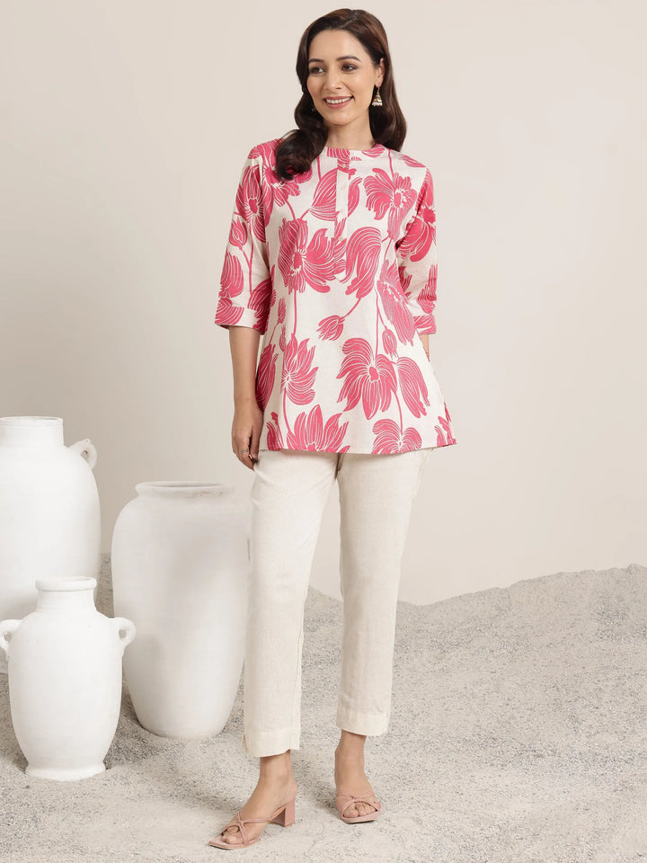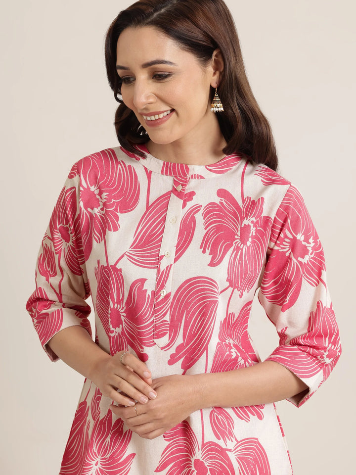 Our pink printed cotton straight short kurti features a mandarin collar with three-quarter sleeves. Highlighted with floral prints and button accents, this style is perfect for casual outings.