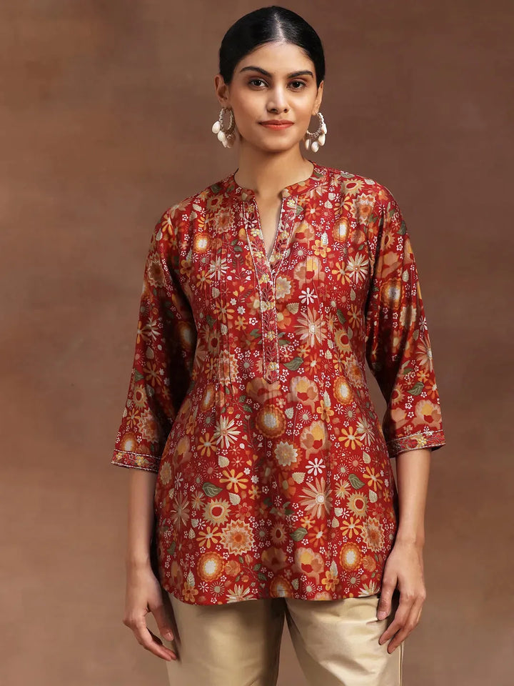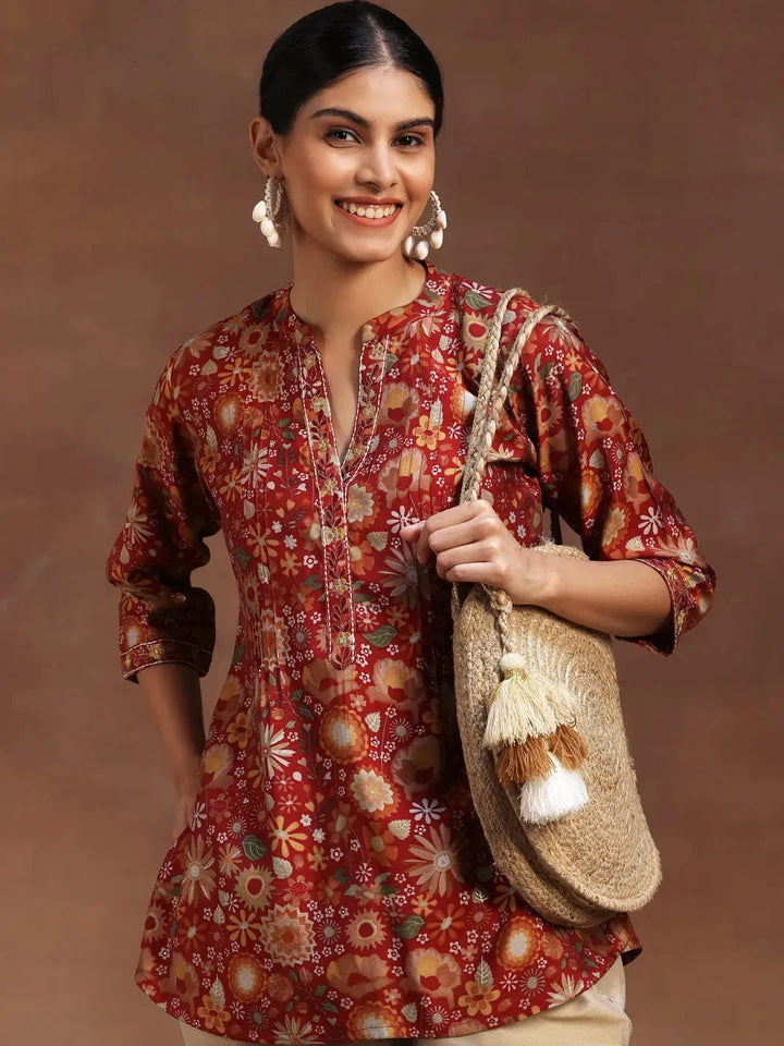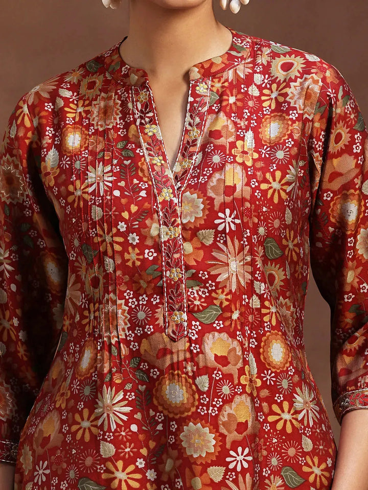 Our red printed silk blend A-line kurti features a mandarin notched neckline with three-quarter sleeves. Highlighted with thread work and captivating floral prints, this style is perfect for work and beyond.