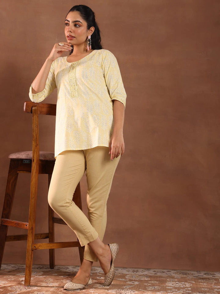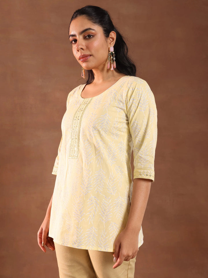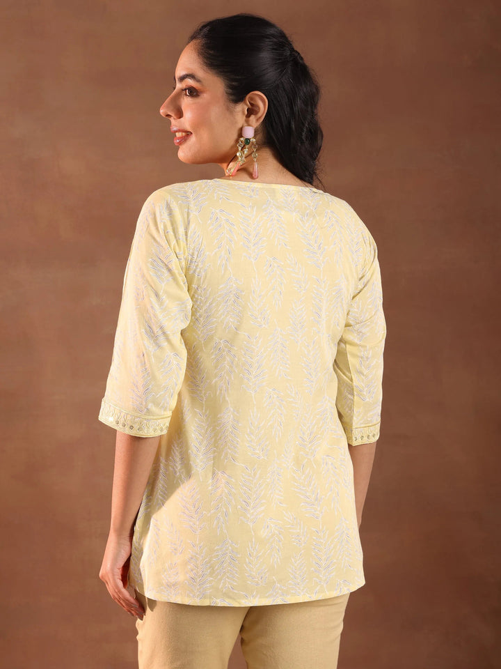 Our 1-piece yellow cotton straight-fit kurta features a round neckline, regular sleeves, and statement Yoke. Adorned with printed embellishments, this style is perfect for casual wear.