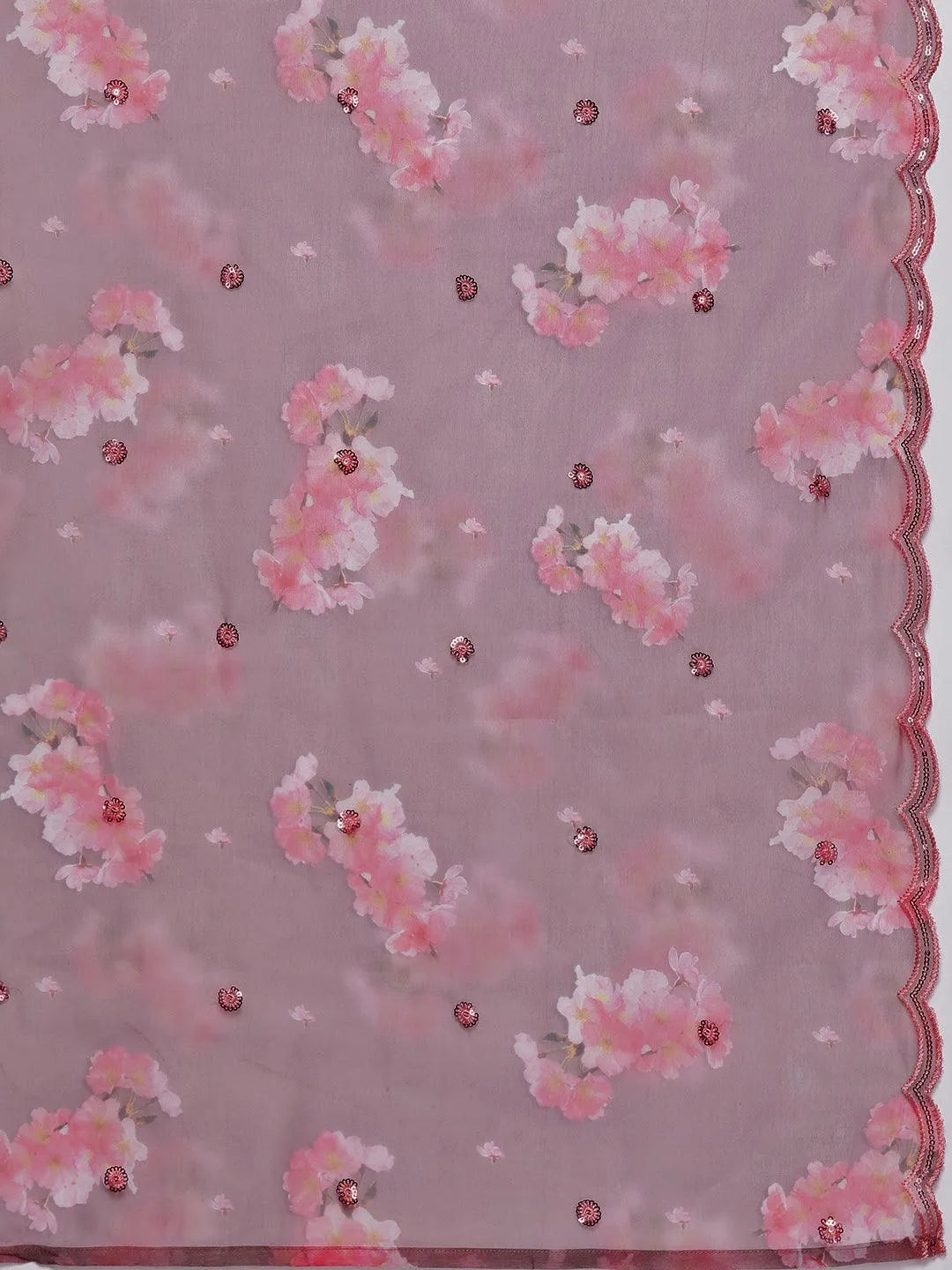 Our 3-piece mauve silk blend suit set features a floral embroidered straight-fit kurta with a notched neckline, full sleeves, and a statement yoke. Complemented with solid tone straight pants with an elasticated waistband and roomy pockets, and a floral print organza dupatta with scalloped detailing. Adorned with intricate thread-work detailing and delicate sequins accents, this elegant style is ideal for light festivities.