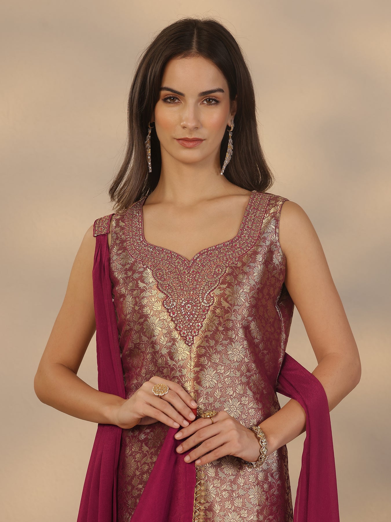 Libas Art Maroon Embroidered Silk Blend Straight Suit Set With Dupatta