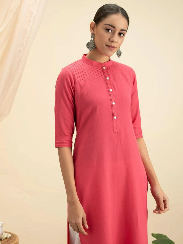 This pink mandarin collar kurta is crafted in a straight cut with side slits. Made in cotton, adorned with contrasting buttons and delicate pin-tuck stitch details.