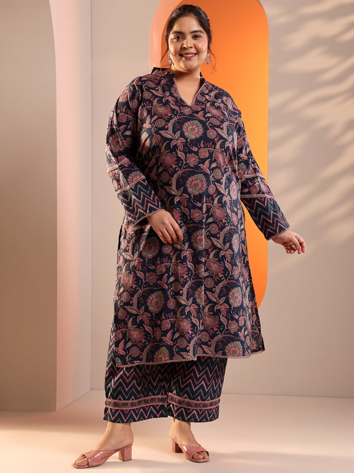 Plus Size Blue Printed Cotton Straight Kurta Set