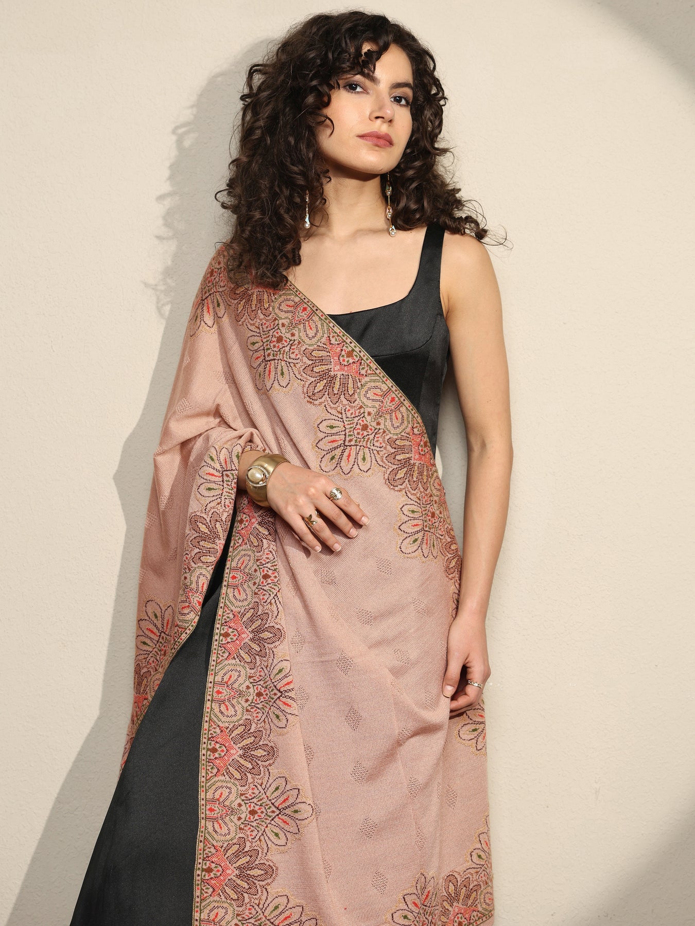 Blush pink woolen shawl featuring intricate floral and geometric woven designs inspired by traditional craftsmanship. Designed to keep you warm and stylish, this versatile wrap pairs effortlessly with your kurta set or drape it with your saree for festive and winter celebrations. Tailored with a detailed border and a convenient hook closure, this shawl ensures both comfort and elegance in every drape.