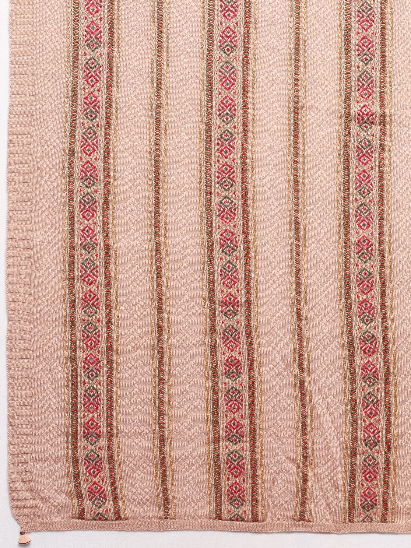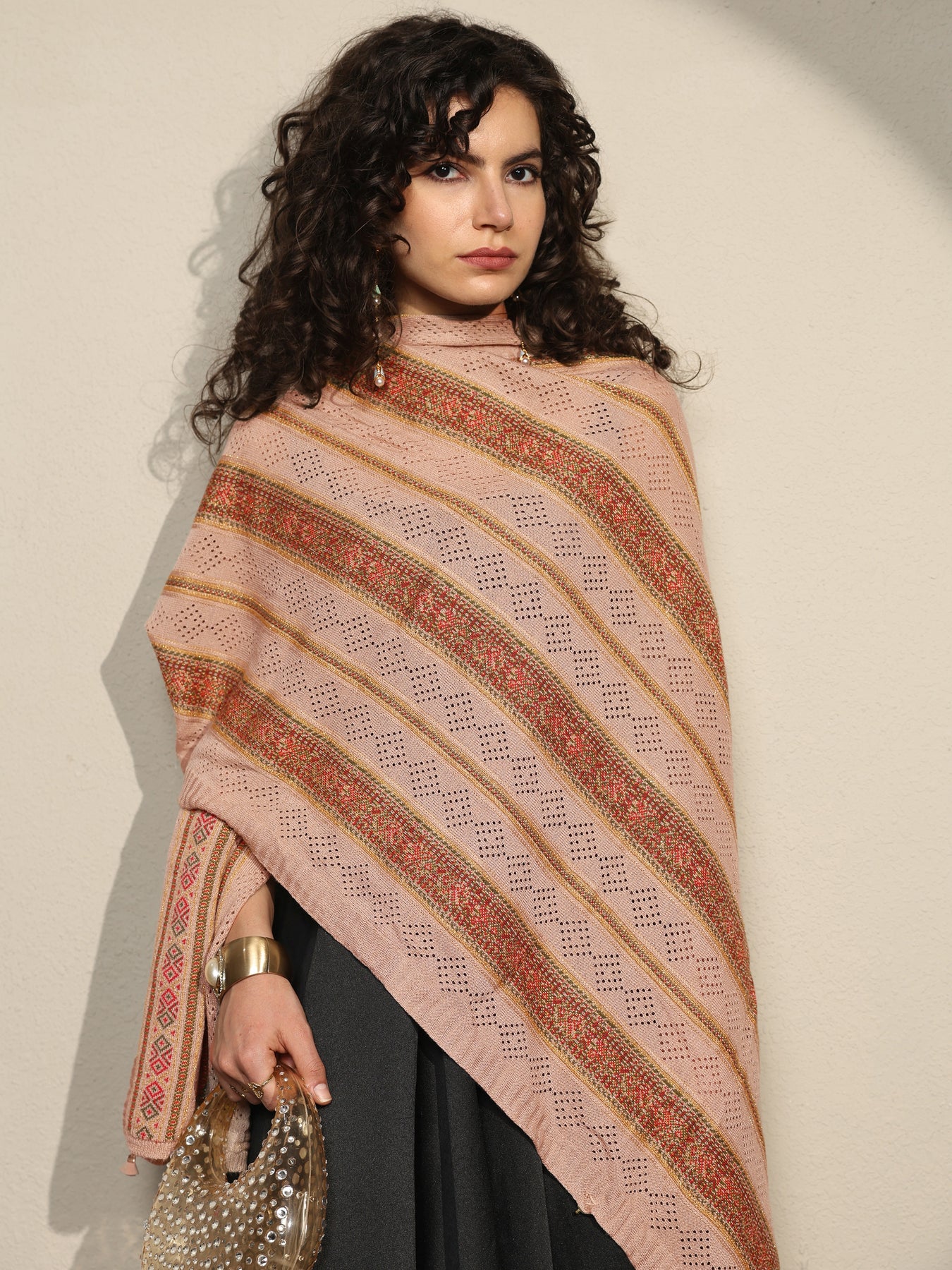 Peach woolen shawl featuring intricate woven designs inspired by traditional motifs. Designed to keep you warm and stylish, this versatile wrap pairs effortlessly with your kurta set or drape it with your saree for festive and winter celebrations. Tailored with delicate woven detailing for comfort and elegance, the shawl includes a soft-drape finish for enhanced usability.