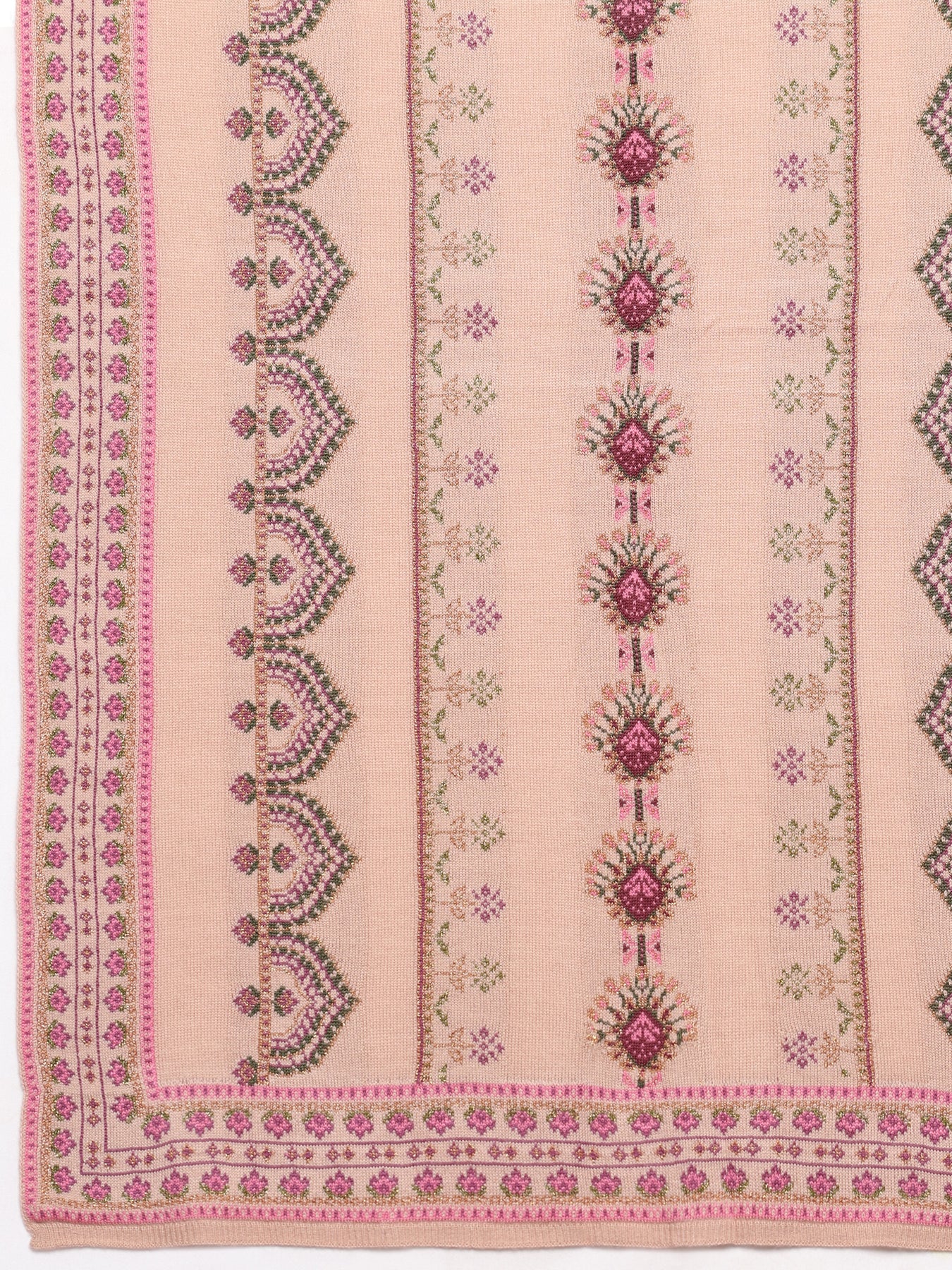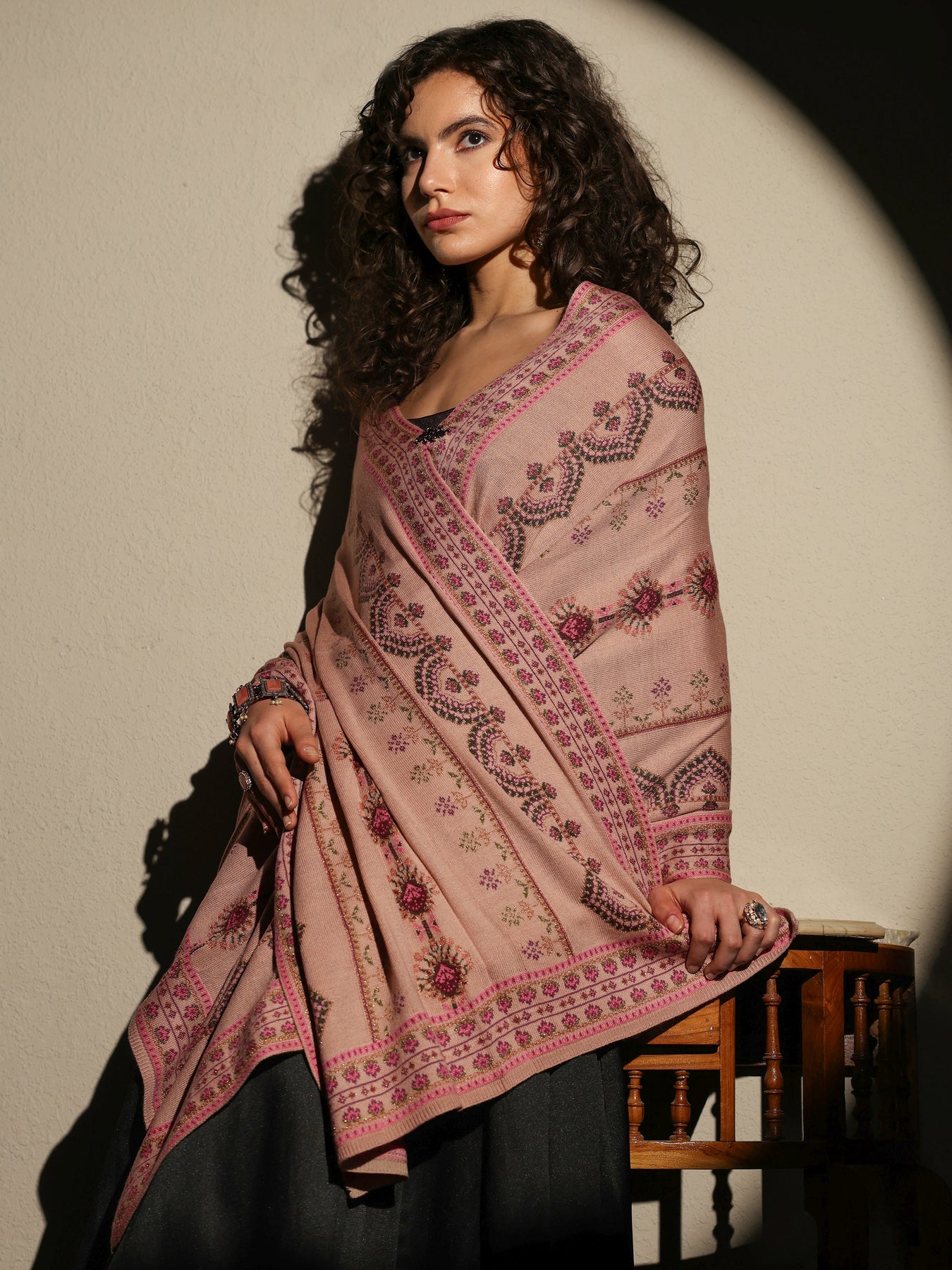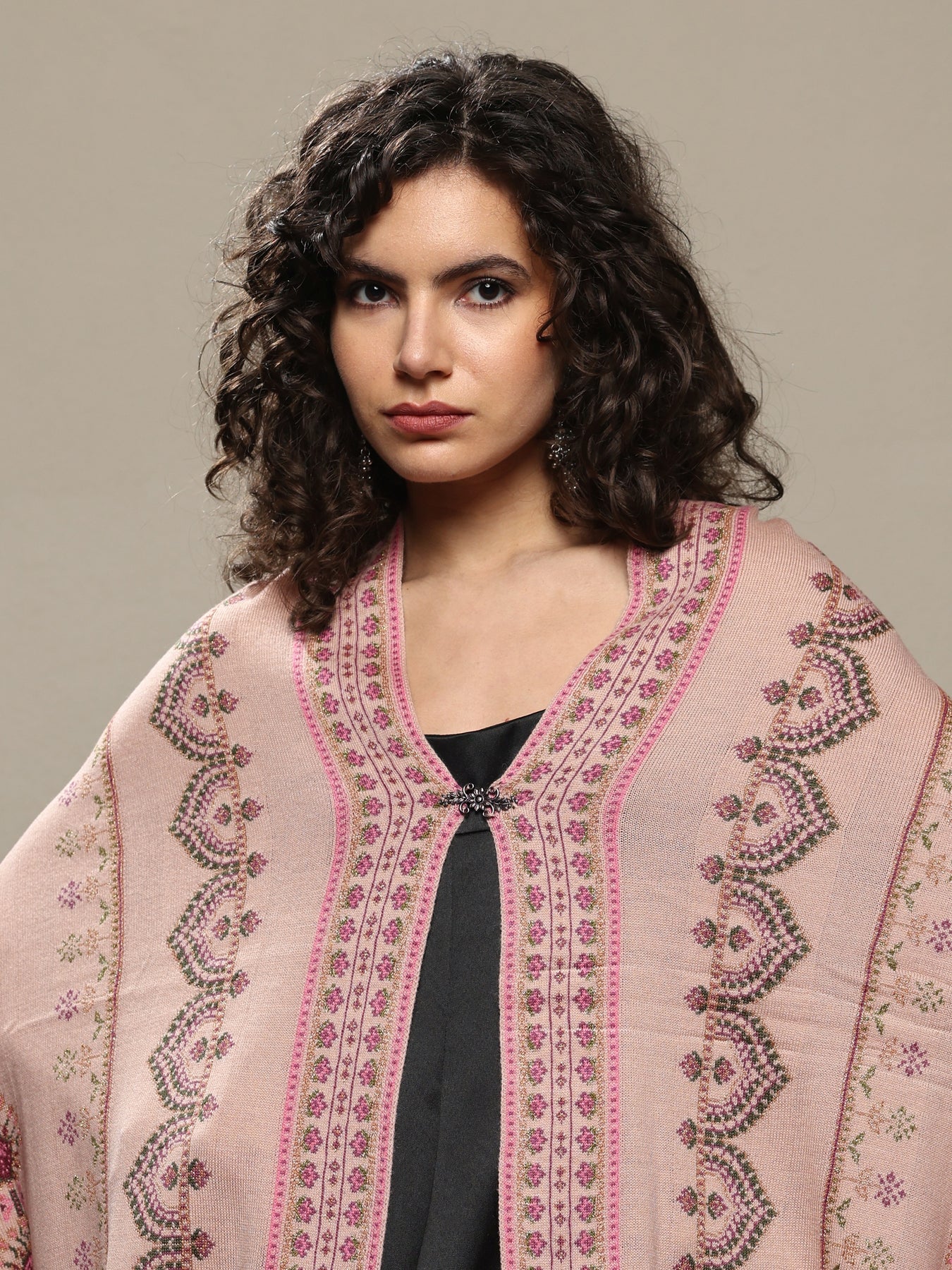 Blush pink woolen shawl featuring intricate woven designs inspired by traditional motifs. Designed to keep you warm and stylish, this versatile wrap pairs effortlessly with your kurta set or drape it with your saree for festive and winter celebrations. Tailored with detailed border work for comfort and elegance, the shawl includes a hook closure for convenient styling.