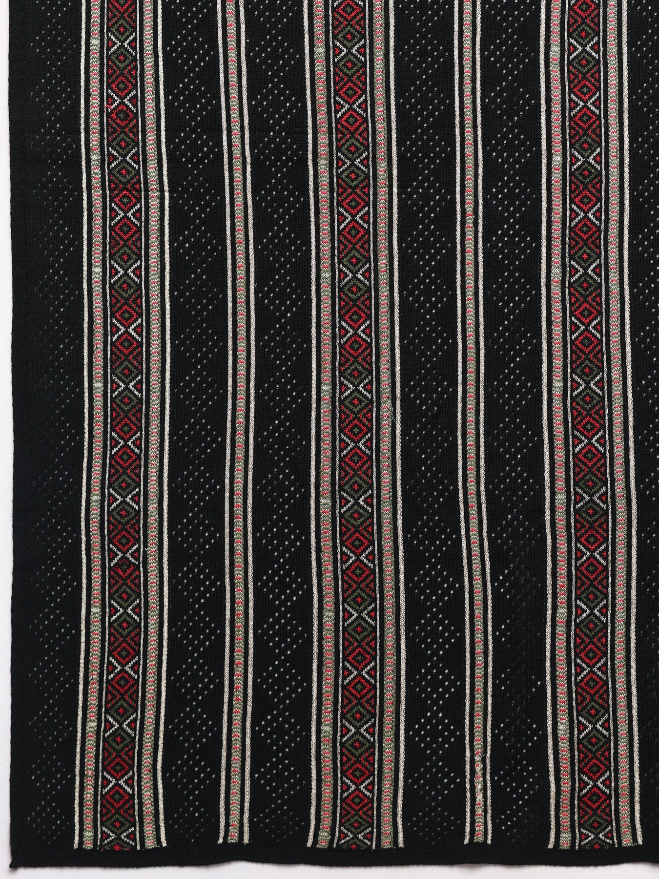 Black woolen shawl featuring intricate woven designs inspired by traditional motifs. Designed to keep you warm and stylish, this versatile wrap pairs effortlessly with your winter ethnic look or drape it with your festive saree for special occasions. Tailored with detailed woven borders, this shawl ensures both comfort and elegance in every drape. The shawl also includes a soft-drape finish for enhanced usability.