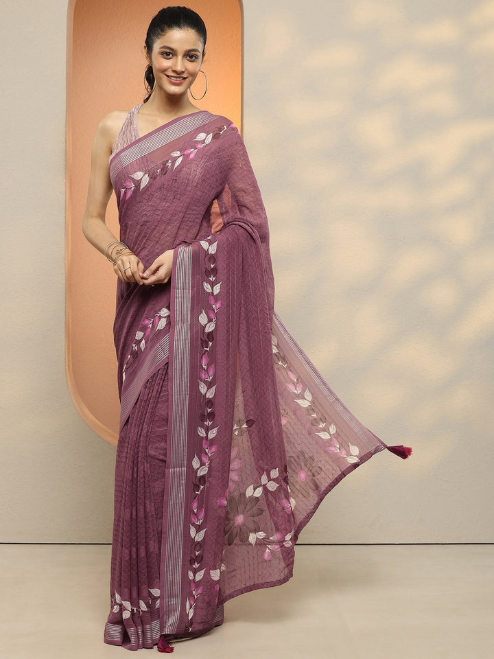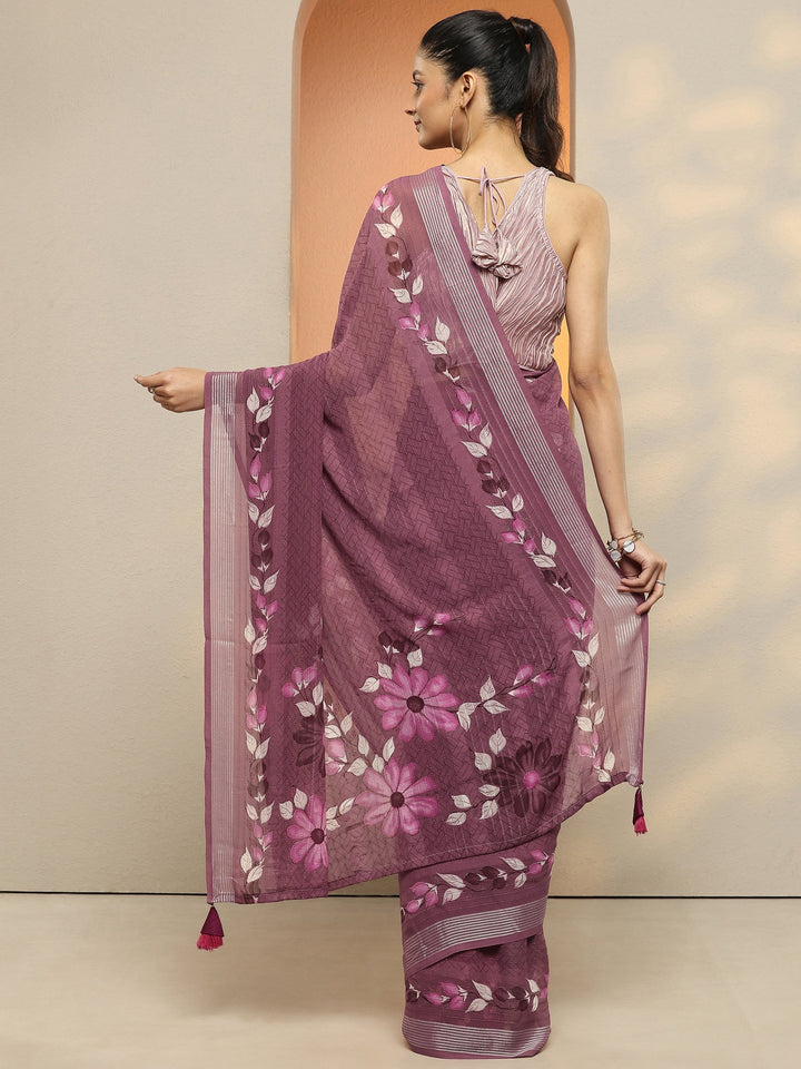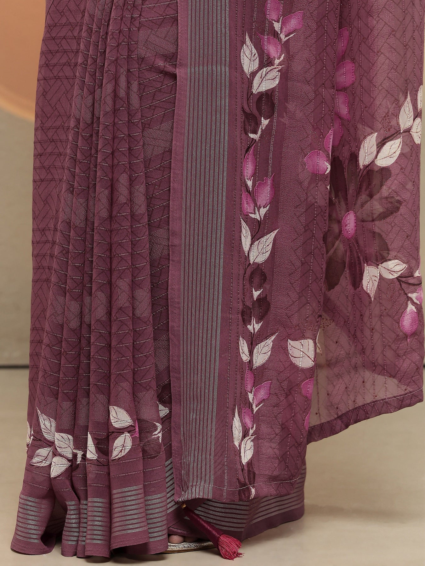 Our Mauve Printed Georgette Saree Features Captivating Floral Print. Complemented With A Blouse Piece. This Charming Saree Is Perfect For Festive Occasions.