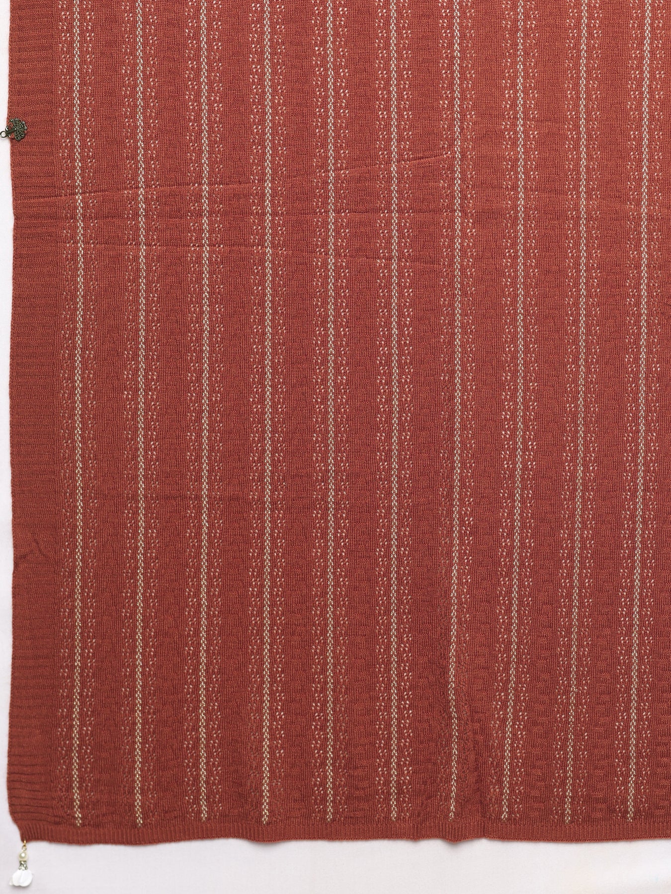 Rust woolen shawl featuring intricate woven stripes inspired by traditional craftsmanship. Designed to keep you warm and stylish, this versatile wrap pairs effortlessly with your kurta set or saree for festive and winter celebrations. Tailored with delicate tassel detailing, this shawl ensures both comfort and elegance in every drape.