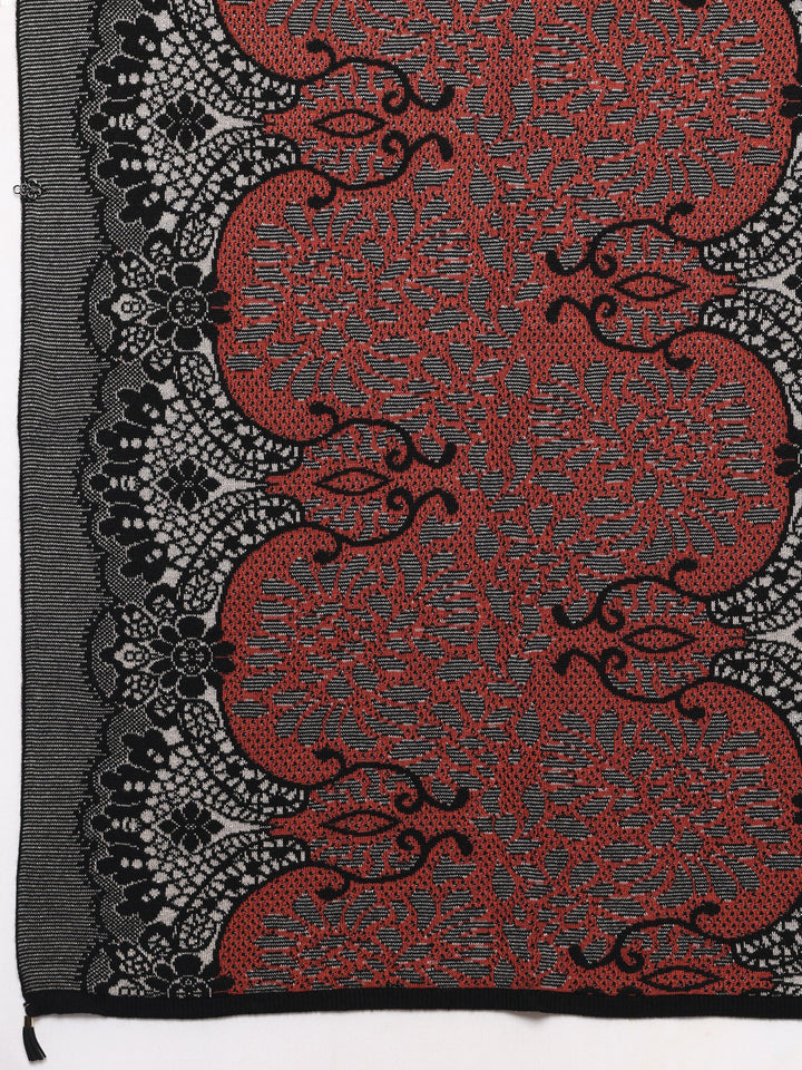 Black and maroon woolen shawl featuring intricate woven designs inspired by traditional motifs. Designed to keep you warm and stylish, this versatile wrap pairs effortlessly with your winter ethnic look or drape it with your festive saree for special occasions. Tailored with detailed woven borders, this shawl ensures both comfort and elegance in every drape. The shawl also includes a soft-drape finish for enhanced usability.