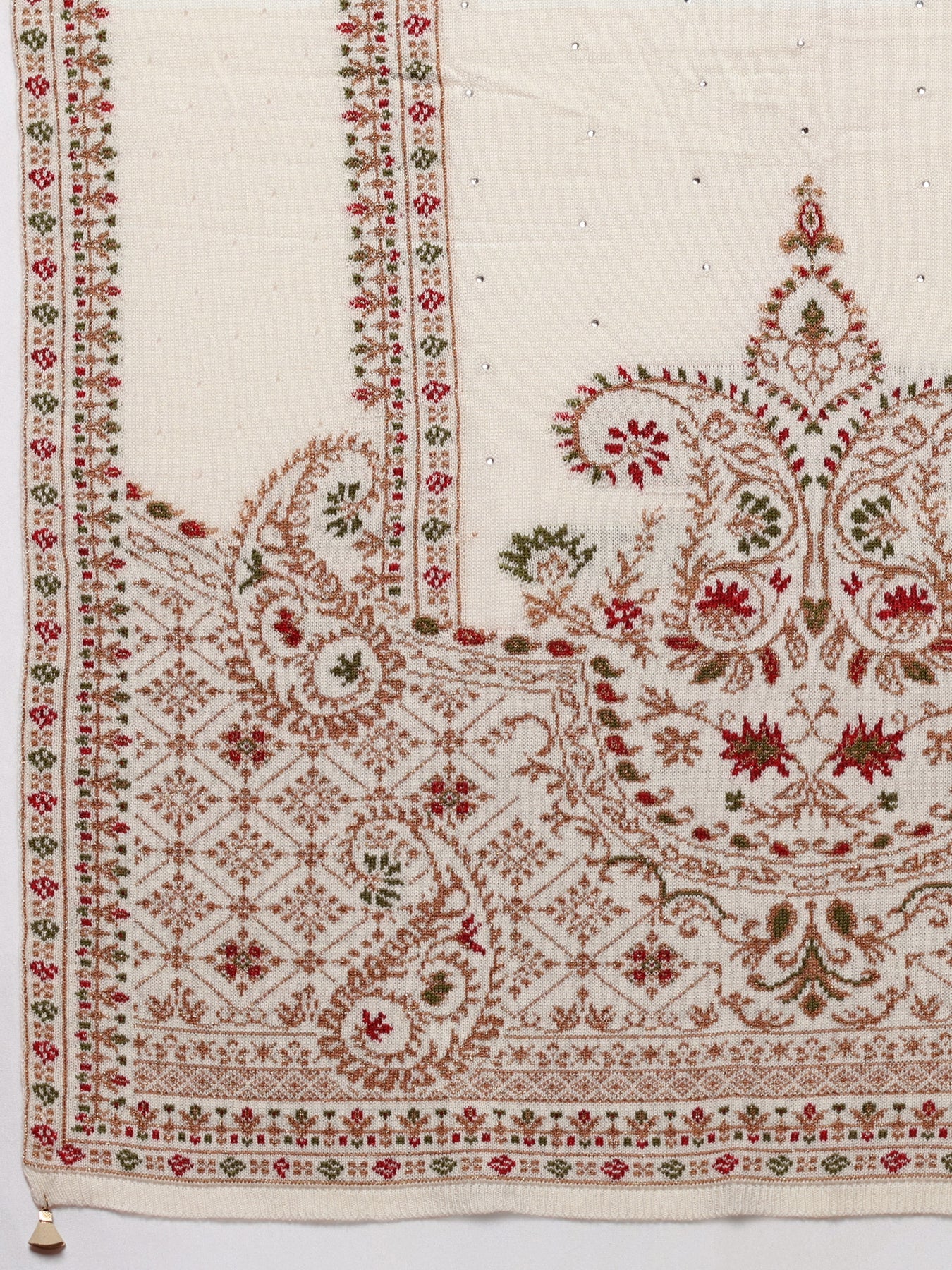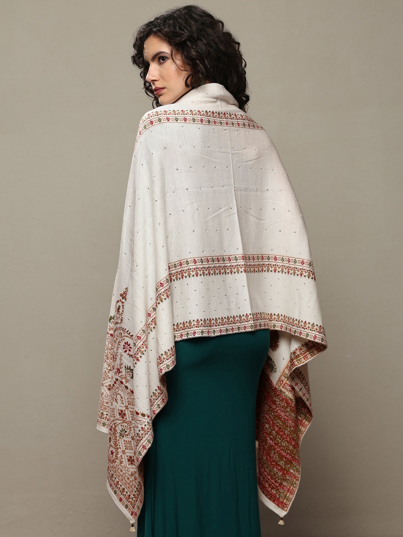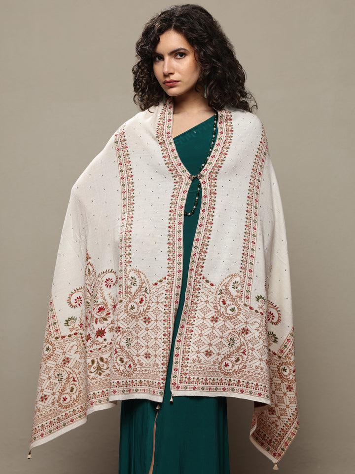 Ivory woolen shawl featuring intricate embroidered patterns inspired by traditional heritage motifs. Designed to keep you warm and stylish, this versatile wrap pairs effortlessly with your saree or kurta set for festive and winter celebrations. Tailored with detailed embroidered borders, this shawl ensures both comfort and elegance in every drape. The shawl also includes a soft-drape finish for enhanced usability.