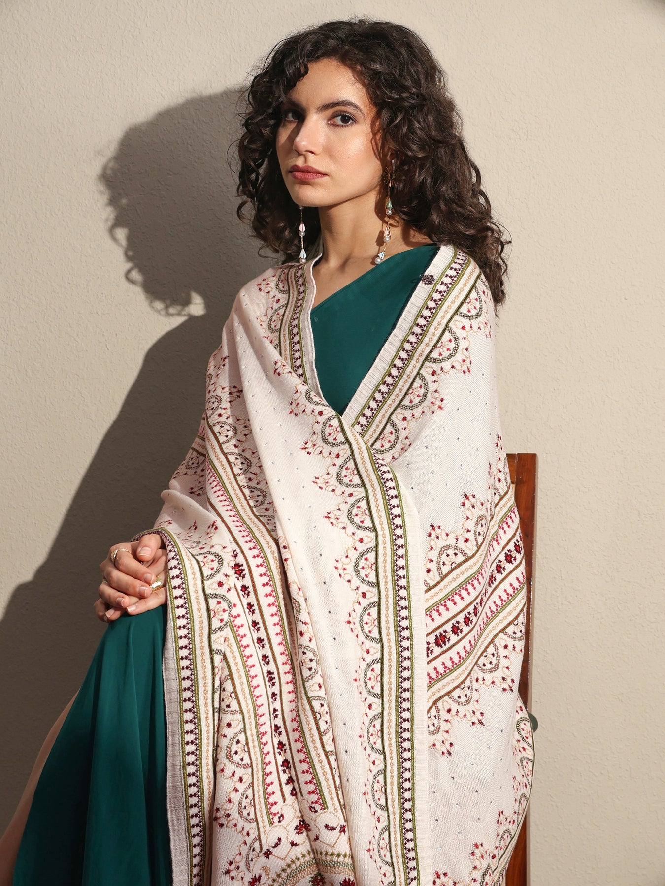 Ivory woolen shawl featuring intricate woven designs inspired by traditional motifs. Designed to keep you warm and stylish, this versatile wrap pairs effortlessly with your kurta set or saree for festive and winter celebrations. Tailored with detailed border work, this shawl ensures both comfort and elegance in every drape. The shawl also includes a soft-drape finish for enhanced usability.