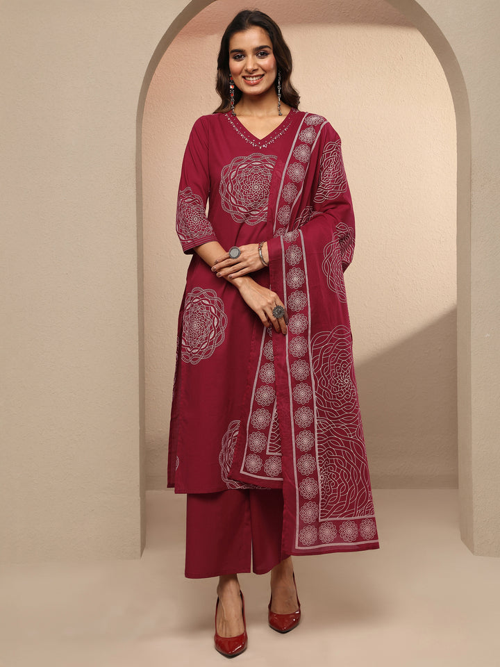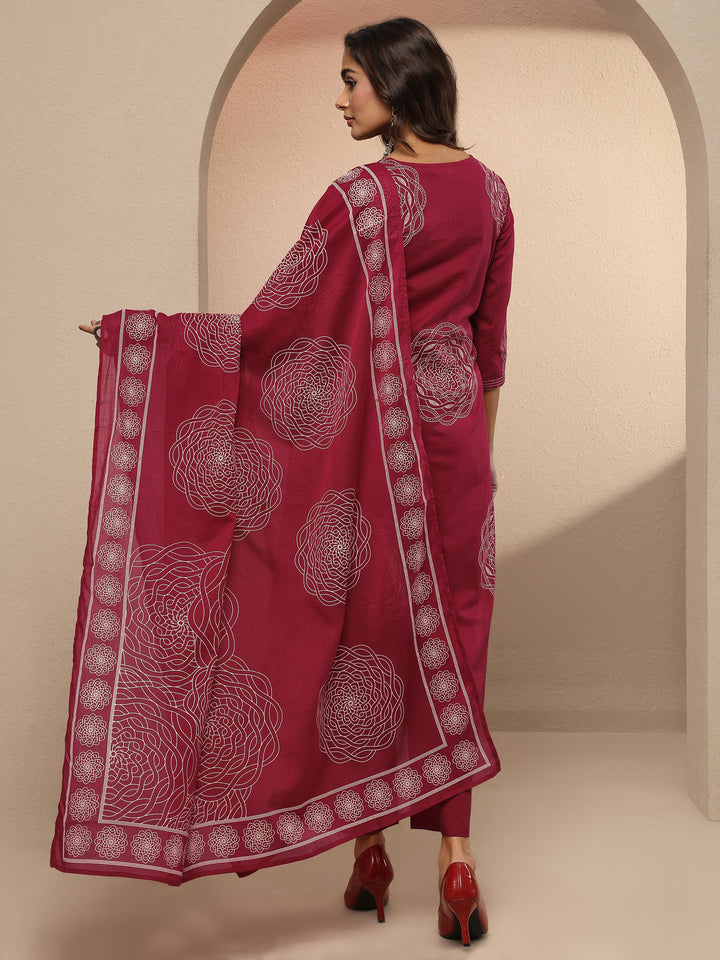 Red Printed Cotton Straight Suit Set With Dupatta