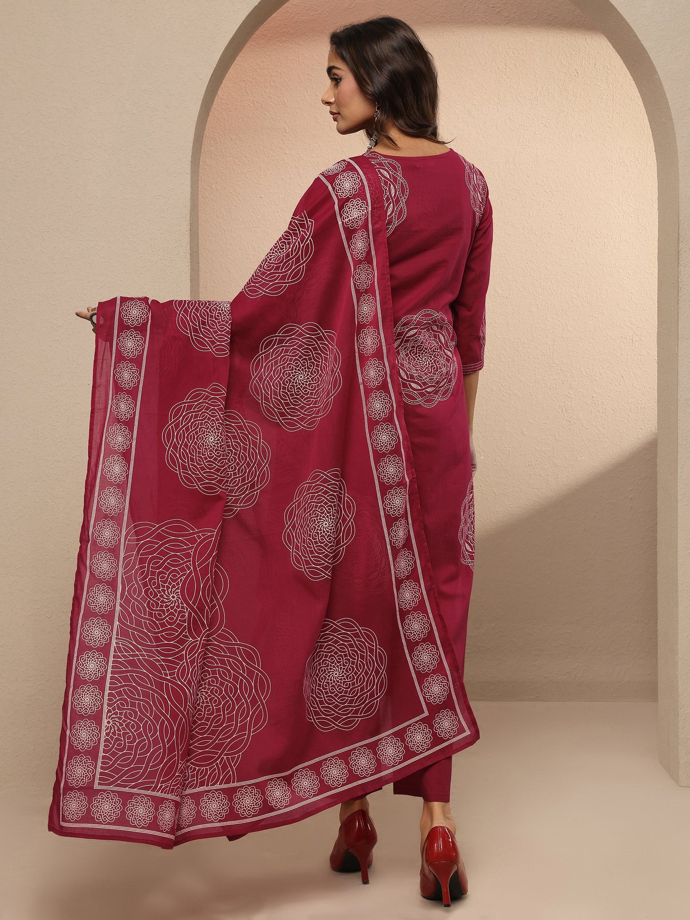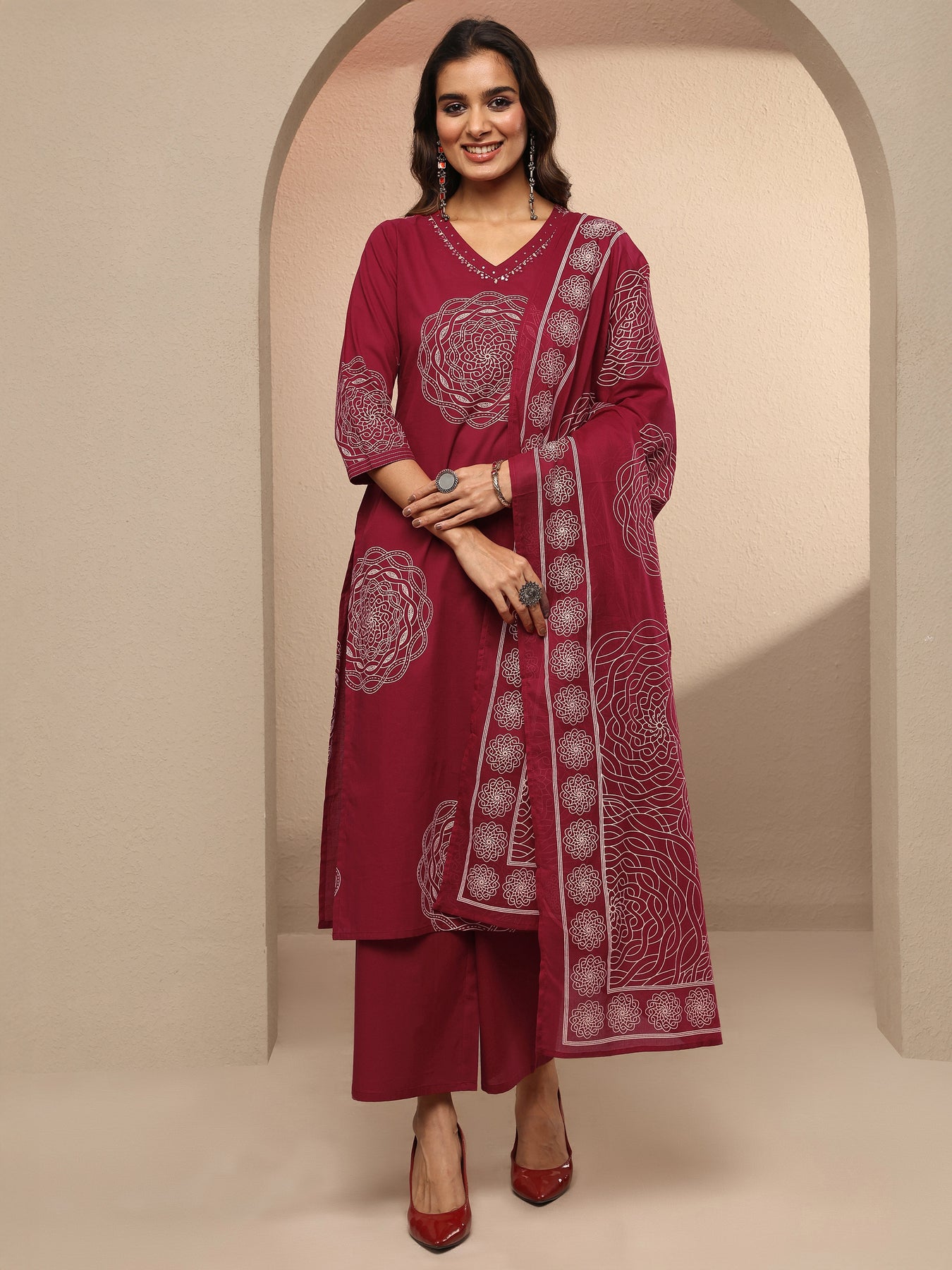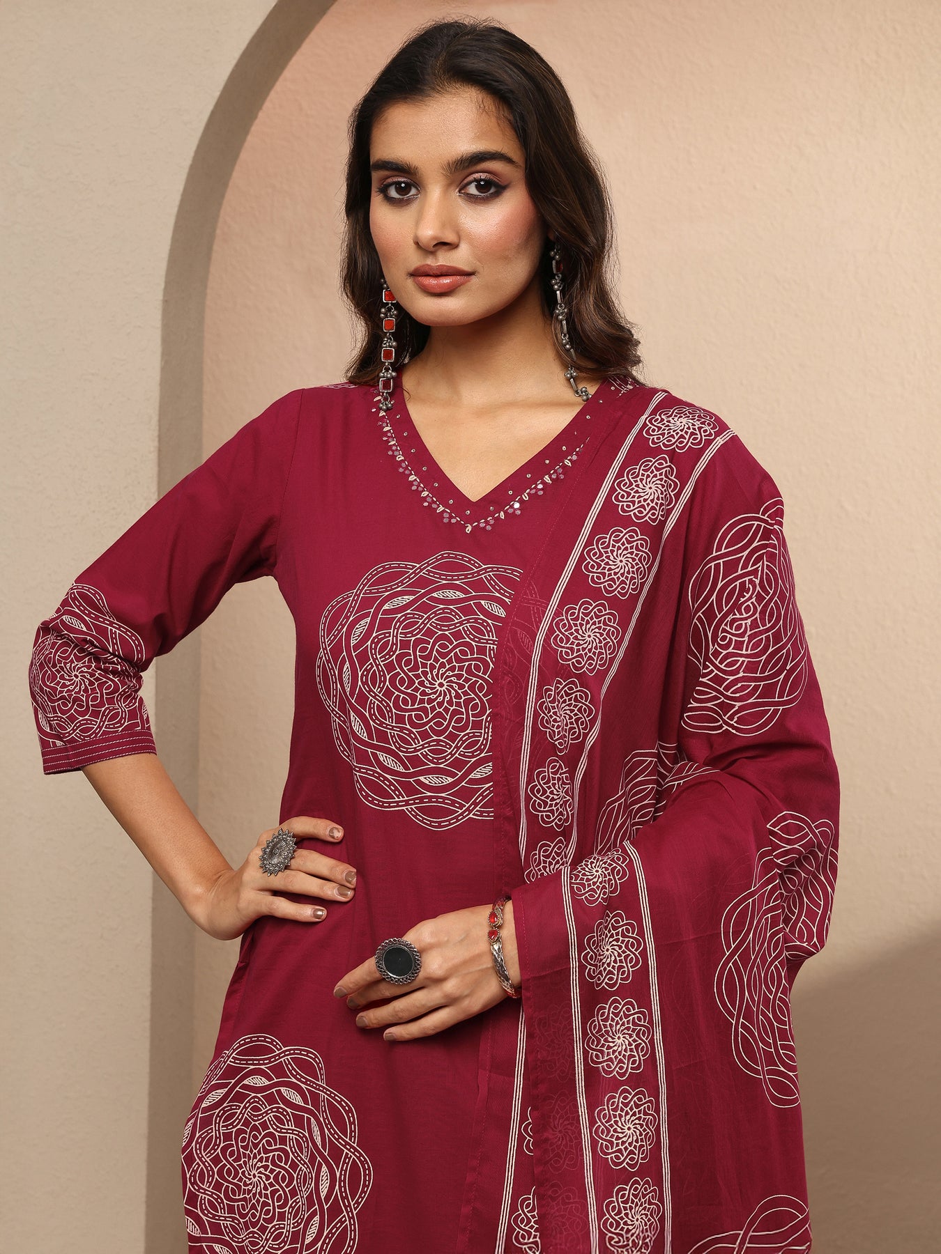 Our 3-piece maroon cotton kurta set features a straight-fit design with a V-neckline, regular sleeves, and statement yoke. Complemented with straight pants with a partially elasticated waistband and 2 pockets, and an Printed dupatta. Adorned with geometric Printed, this style is perfect for Dark Festive.