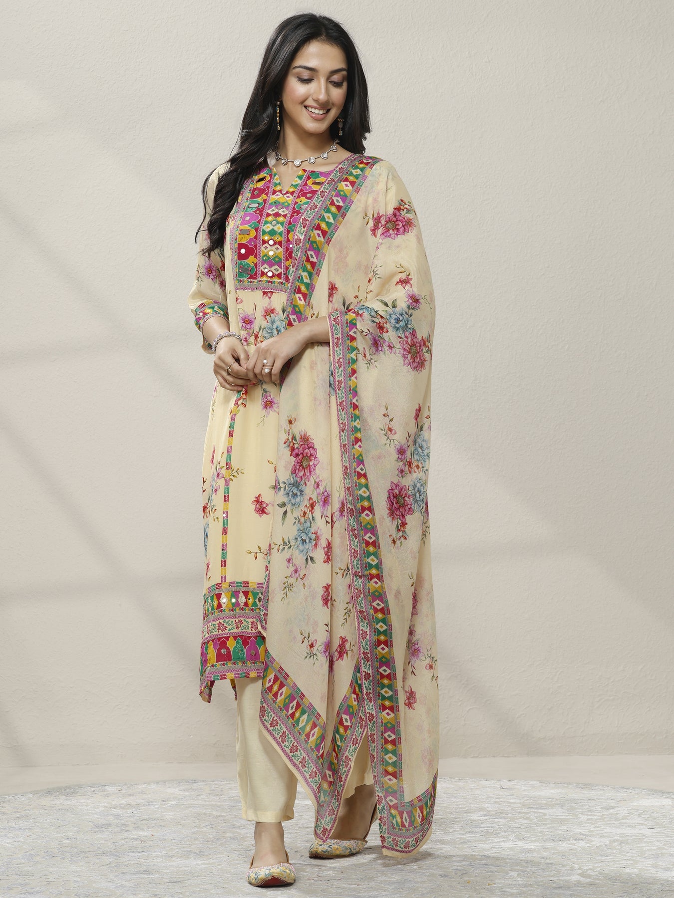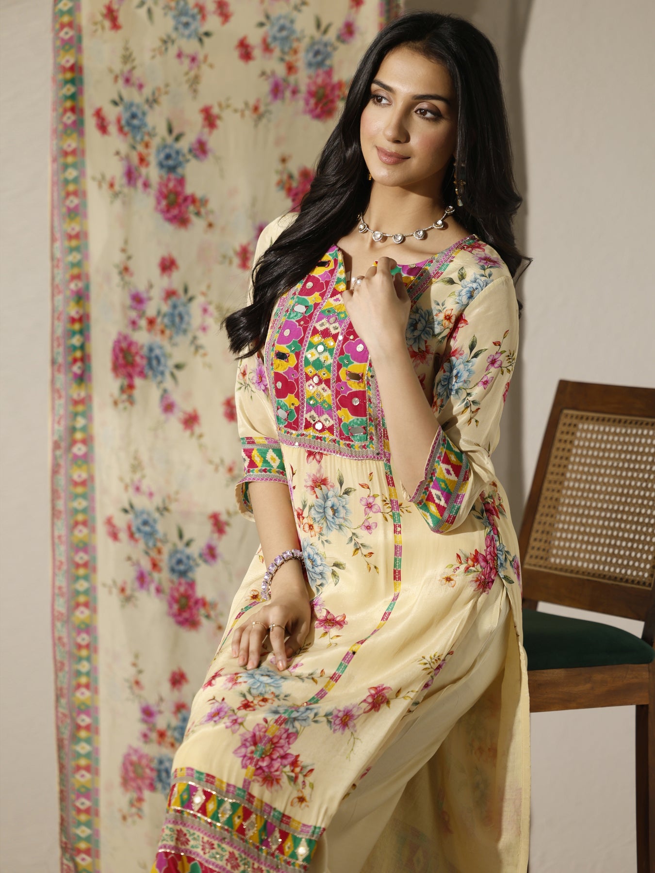 Our 3-piece cream multi Chinon straight-fit kurta set features a round neckline, regular sleeves, and statement yoke. Complemented with straight pants with a partially elasticated waistband and a floral dupatta. Adorned with floral printed, this style is perfect for festive occasions.