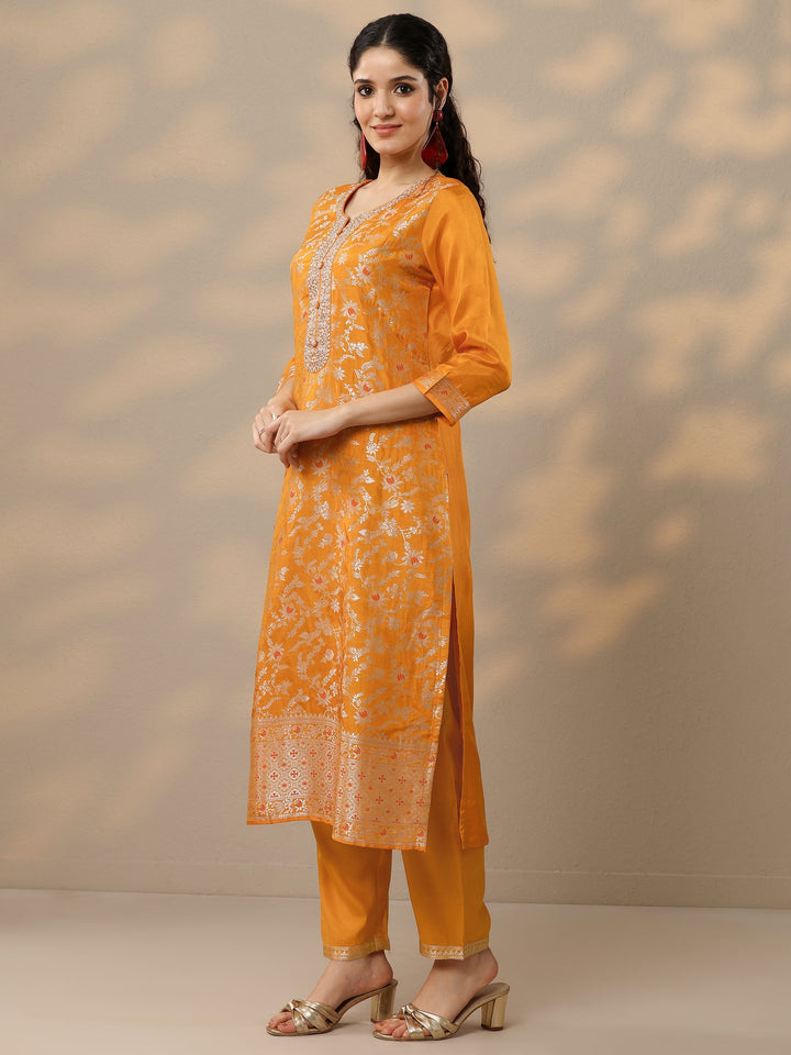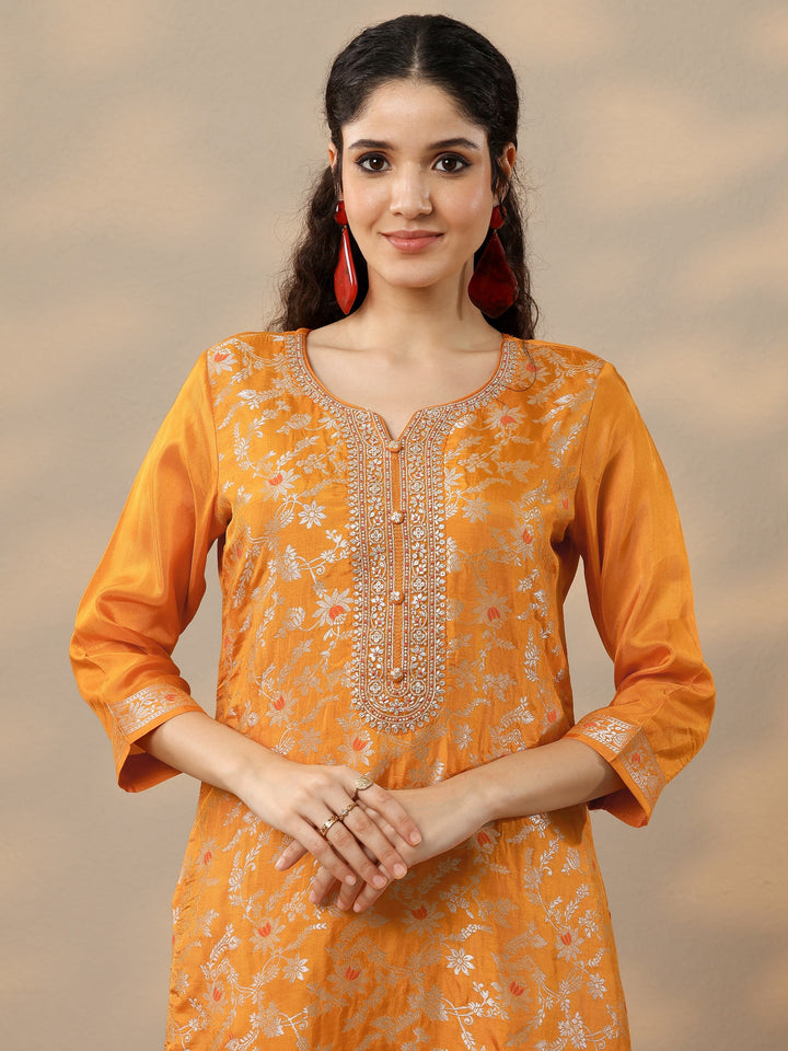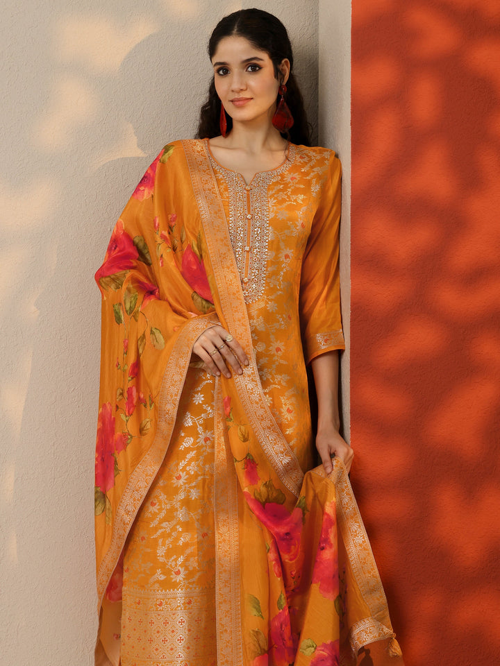 Orange Woven Design Silk Blend Straight Suit Set With Dupatta