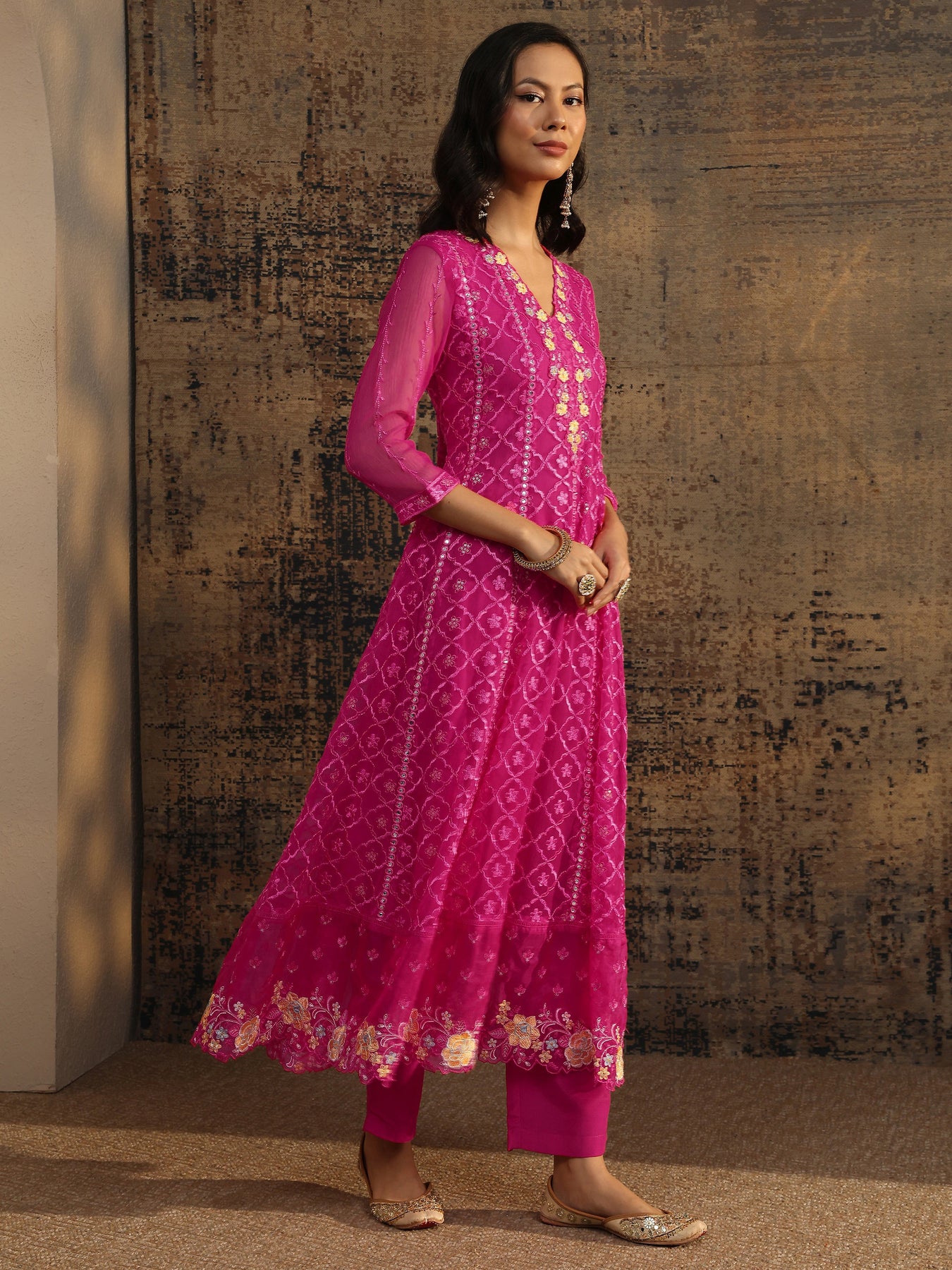 Pair this Anarkali embroidered kurta with elegant jewellery, a chic clutch bag, and embellished juttis to achieve a refined look suitable for festive occasions.