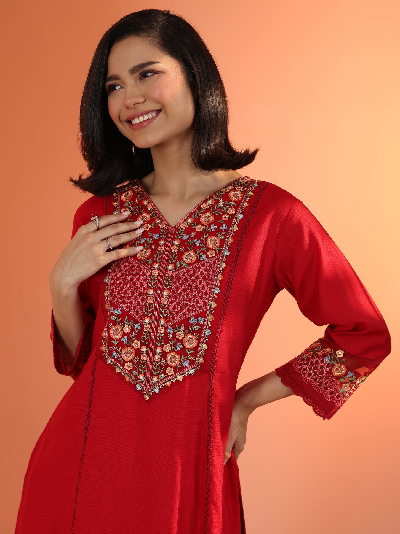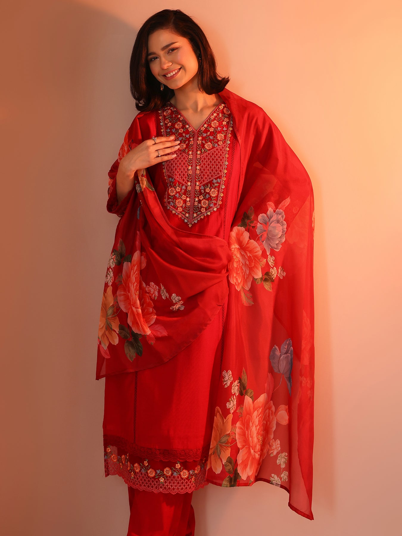 Red Embroidered Silk Blend Straight Suit Set With Dupatta