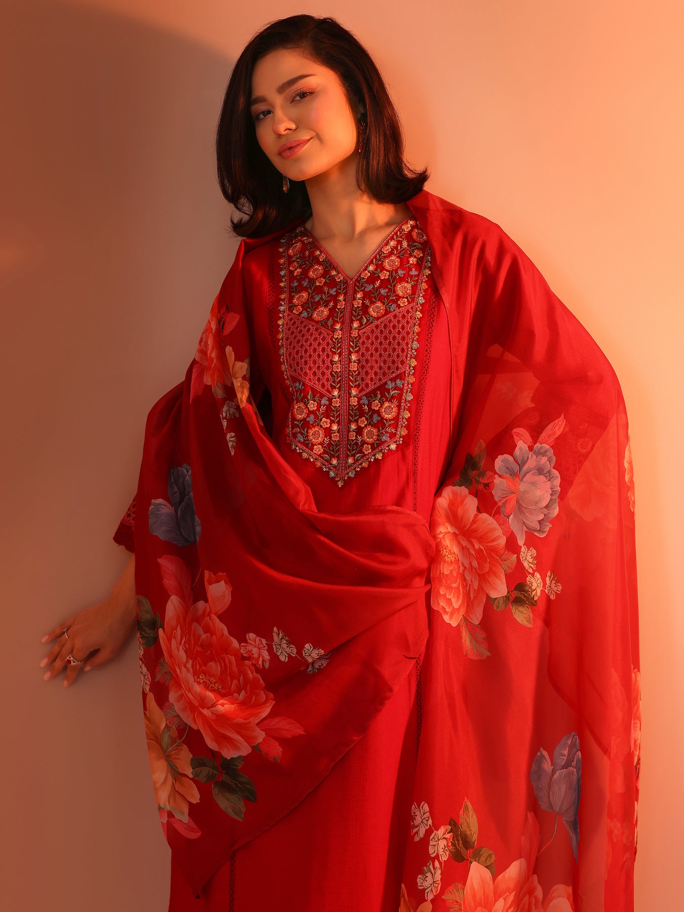 Our 3-piece Red Silk blend Straight-fit Kurta Set features a V-Neckline, Regular Sleeves, and statement yoke. Complemented with Lining and Straight Pants with a Partially Elasticated waistband and 2 pockets, and a Printed dupatta. Adorned with Floral Embroidered accents, this style is perfect for Semi festive wear.