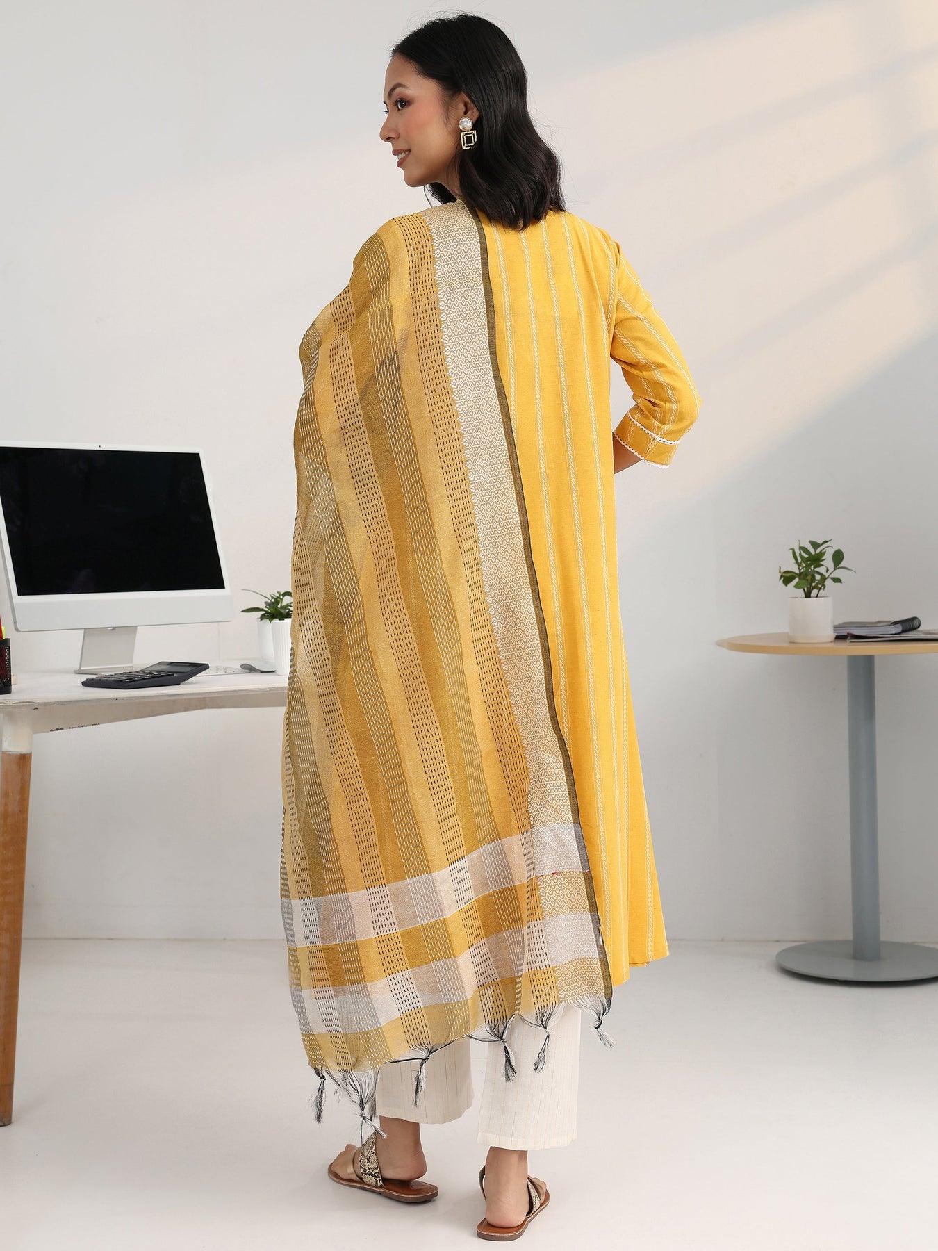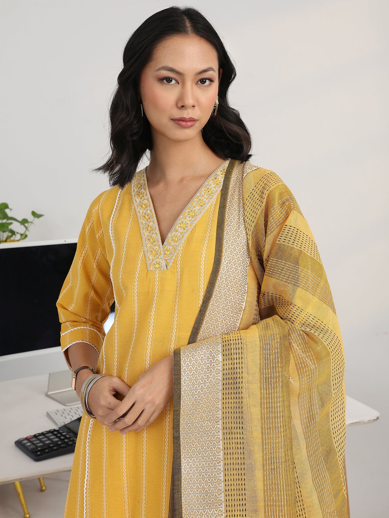 Our 3-piece yellow and white cotton blend a-line kurta set features a V-neckline, regular sleeves, and statement yoke. Complemented with straight pants with a partially elasticated waistband and 2 pockets, and a woven design dupatta. Adorned with ethnic motif woven design, this style is perfect for Work Wear and Casual Wear.