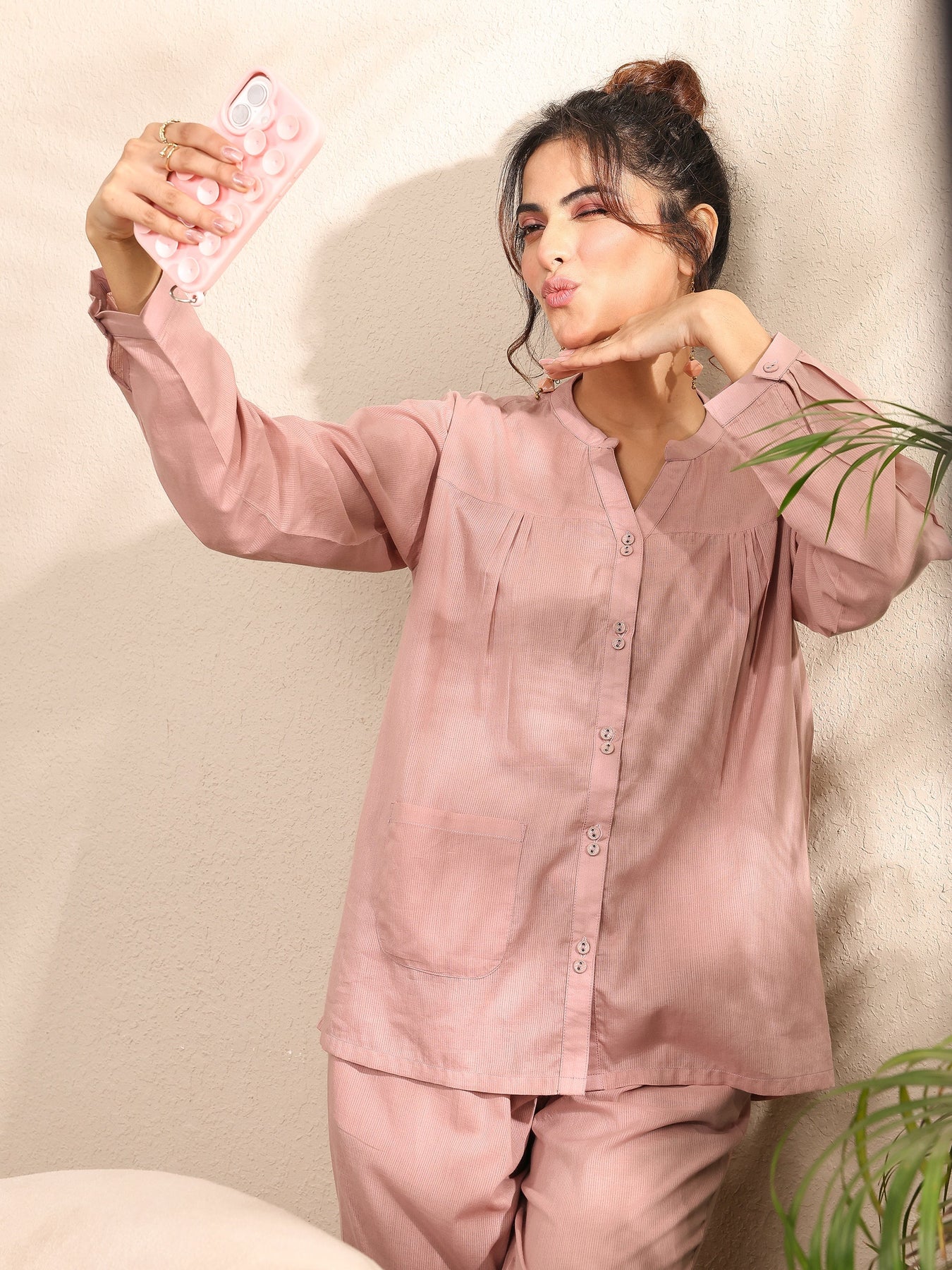 Our 2-piece Mauve printed Cotton nightsuit features a Straight-fit Shirt with a Mandarin Collar neckline and Long Sleeves. Complemented with matching Pyjamas with a Partially Elasticated waistband and 2 pockets. Elevated with solid, this style is perfect for Night Wear.