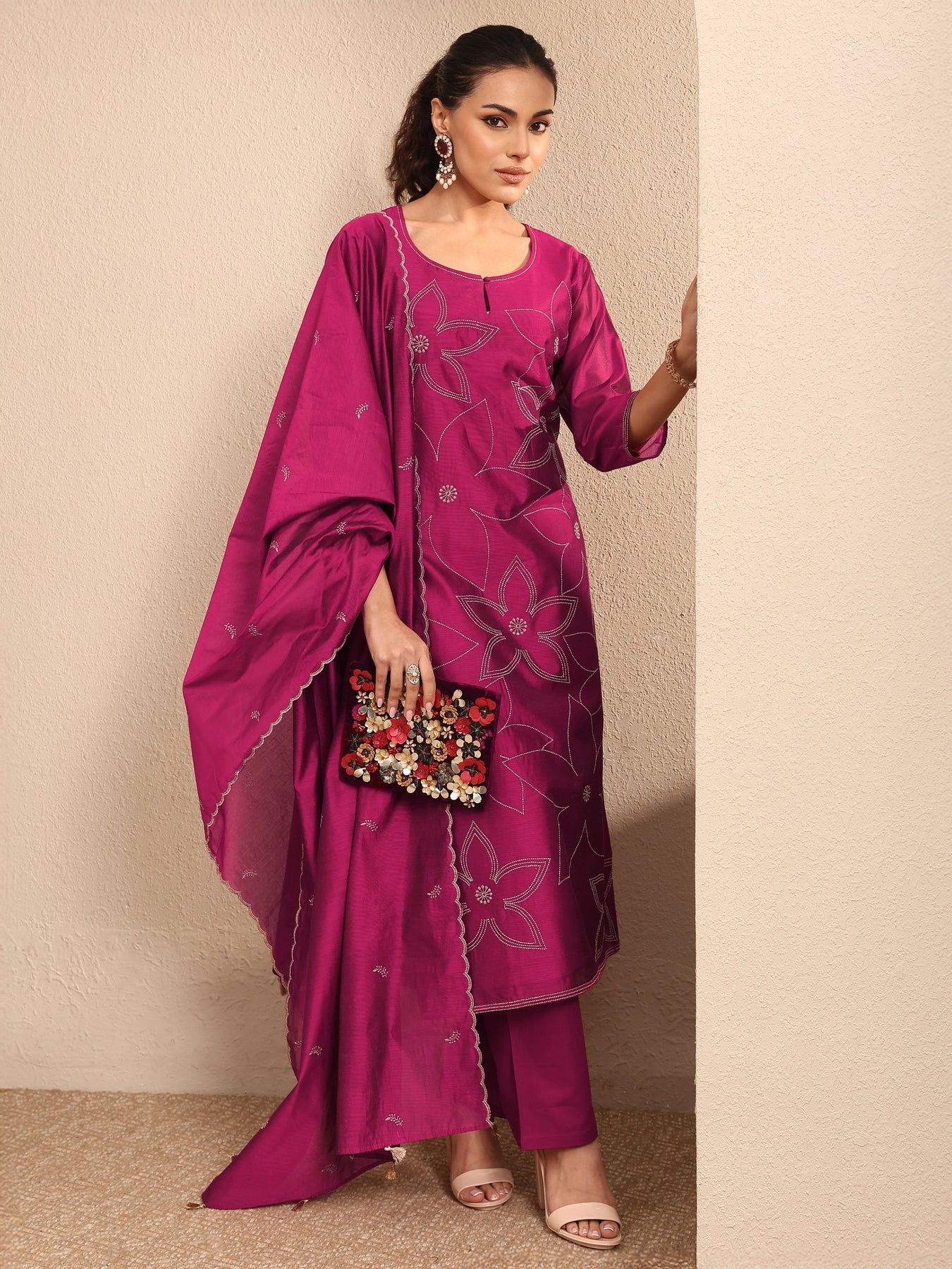 Magenta Embroidered Silk Blend Straight Suit Set With Dupatta