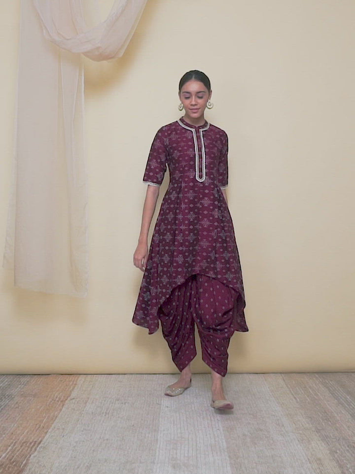Purple Printed Silk A-Line Kurta With Dhoti Pant